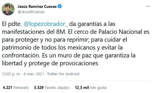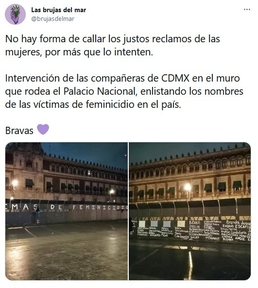 Luego de que autoridades de la Ciudad de México colocaron vallas en diversos recintos de la capital, como el Palacio Nacional, con motivo de las manifestaciones por la conmemoración del Día Internacional de la Mujer este 8 de marzo, colectivos feministas decidieron darle una vuelta y colocaron los nombres de cientos de mujeres que han sido asesinadas en el país.Varias mujeres se reunieron la noche de este sábado en los alrededores de Palacio Nacional, y con pintura blanca comenzaron a colocar los nombres de las víctimas de feminicidio; Ivonne, Brenda, Josselin, Wendy, Paloma, fueron algunos de los cientos de mujeres que han muerto a manos de algún hombre.En su cuenta de Twitter, Brujas del Mar, un colectivo feminista, informó que dicha actividad fue realizada por el grupo “Vivas nos queremos”, mismo que se encargó de colocar un antimonumento frente a Bellas Artes, en la Ciudad de México.“No hay forma de callar los justos reclamos de las mujeres, por más que lo intenten”, escribieron en Twitter acompañado de una imagen donde se ven las vallas, ahora pintadas con cientos de nombres.Desde el pasado viernes, el Palacio Nacional amaneció cercado con barreras de acero de gran altura, desde luego esto trajo cientos de críticas por parte de usuarios de Internet que denominaron este cerco como #MurallaChaira.Ante la ola de críticas, el Presidente Andrés Manuel López Obrador (AMLO) dijo que estas vallas son para “evitar que haya heridos porque hay mucha provocación, muchos infiltrados (…) no es porque tengamos miedo”.Además, poco después, el vocero de la Presidente, Jesús Ramírez Cuevas, denominó el cerco en Palacio Nacional como “un muro de paz que garantiza la libertad y protege de provocaciones”.GC