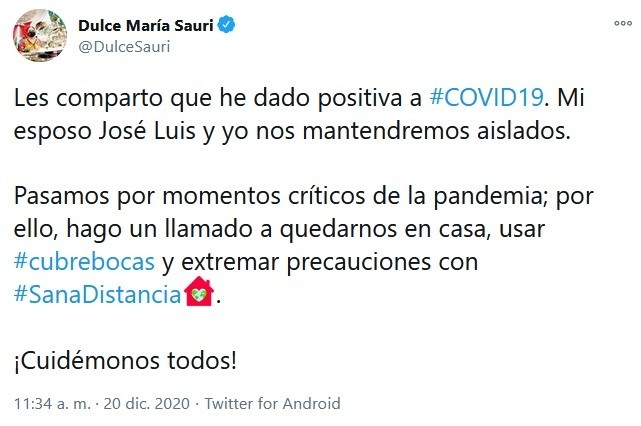 Dulce María Sauri, presidenta de la Mesa Directiva de la Cámara de Diputados, dio positivo a COVID-19."Les comparto que he dado positiva a COVID19. Mi esposo José Luis (Sierra) y yo nos mantendremos aislados", dio a conocer Sauri en su cuenta de Twitter. La legisladora hizo además un llamado a la población a quedarse en casa, usar cubrebocas y extremar precauciones.La Ciudad de México y el Estado de México regresaron al semáforo rojo por el aumento de contagios de coronavirus, por lo que las actividades no esenciales se suspenderán desde el sábado 19 de diciembre hasta el domingo 10 de enero de 2021.IM