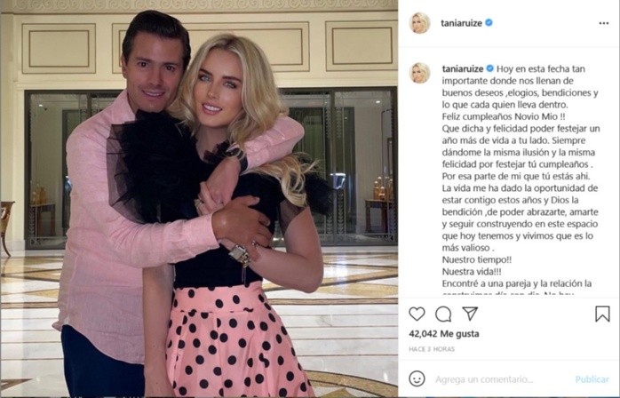 El expresidente de México, Enrique Peña Nieto (EPN) reapareció este martes en redes sociales junto a su novia Tania Ruiz, quien lo felicitó por su 55 años cuando faltan menos de dos semanas para la consulta popular sobre enjuiciar a los exmandatarios mexicanos."Hoy en esta fecha tan importante donde nos llenan de buenos deseos, elogios, bendiciones y lo que cada quien lleva dentro. Feliz cumpleaños novio mío", inicia la publicación de Ruiz en Instagram acompañada de una foto de ambos abrazados.La modelo de 33 años, que según algunos medios vive con Peña Nieto en una lujosa residencia en Madrid, continuó expresando "dicha y felicidad" por poder celebrar esta fecha juntos un año más además de la "ilusión" de este día.Además, escribió que "Dios" les dio "la bendición" de poder vivir en pareja y construir una amistad que, con el paso del tiempo, se ha ido afianzando."Encontré a una pareja y la relación la construimos día con día. No hay experiencia sin caídas y no hay evolución sin tropiezos. Siempre haciendo frente a cada situación que hemos vivido y de la mano, junto con Dios. Que Dios te bendiga, proteja, cuide hoy y siempre deseando lo mismo para todos. ¡Te amo! ¡Feliz día mi novio hermoso!", terminó el mensaje.EPN celebró su cumpleaños a menos de dos semanas de la consulta popular convocada por el Presidente Andrés Manuel López Obrador (AMLO) para que los ciudadanos decidan si enjuiciar por corrupción y otros delitos a los exmandatarios del país.Desde que Peña Nieto dejó la Presidencia en 2018 con una maltrecha popularidad, el expresidente ha mantenido un perfil bajo con escasas apariciones en redes sociales y en público.JM