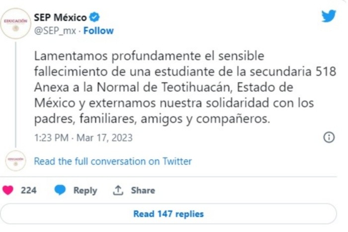 Ante el caso de Norma Lizbeth, la estudiante de Teotihuacán, en el Estado de México, de 14 años de edad que murió luego de ser golpeada, la Secretaría de Educación Pública (SEP) tuvo una reacción tardía.Días después de ocurrida la muerte de Norma Lizbeth, la SEP se pronunció solo con un par de publicaciones con respecto al caso de la estudiante que era víctima de bullying.Ante la tardía reacción en la que la SEP se limitó a lamentar y condenar la muerte de la estudiante de Teotihuacán, se han lanzado diversas críticas contra la dependencia.Luego de casi 5 días de ocurrida la muerte de la estudiante de Teotihuacán de nombre Norma Lizbeth, la SEP por fin emitió un pronunciamiento sobre el caso de la adolescente.A través de Twitter, la dependencia federal compartió un par de breves mensajes en los que asumió una postura en torno a la muerte de la estudiante que era víctima de bullying.En un primer tuit, la SEP destacó que lamenta de forma profunda la muerte de Norma Lizbeth, por lo cual externó su solidaridad a los padres, familiares, amigos y compañeros de la estudiante.Dicha publicación, además de lamentar el caso, únicamente ahondó en los datos de la escuela de Teotihuacán, en el Estado de México, donde ocurrieron los hechos.Y es que en su tuit, la SEP no ofreció colaboración alguna con las autoridades del Estado de México con el fin de esclarecer el caso de la muerte de la estudiante.CR