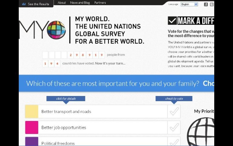 GUADALAJARA, JALISCO (16/ABR/2013).- La principal preocupación de los habitantes del mundo para el desarrollo futuro es una buena educación. Así lo deja ver la encuesta My World, lanzada en línea por la Organización de las Naciones Unidas (ONU). Después de educación (202 mil 428 votos), mejor calidad de salud (186 mil 919 votos) y un gobierno honesto (174 mil 13 votos) son los puntos que encabezan la lista de 16 inquietudes para el futuro, de acuerdo con la opinión de 298 mil 543 personas que han votado sus seis opciones de temas en la encuesta, cuya misión es abrir la participación de los habitantes del mundo en la integración de los tópicos que conformarán la Agenda de Desarrollo Post-2015. "Independientemente del nivel de estudios, todos dicen que la educación para ellos sigue siendo fundamental, y piden más bien que esto siga integrado en las negociaciones para la agenda que va a venir", comenta María Fare García, impulsora de la encuesta My World de la ONU. ¿Qué sigue cuando llegue la fecha meta para Objetivos de Desarrollo del Milenio? Es lo que pretende responder la Agenda de Desarrollo Post-2015, y se alista para asegurar que la globalización signifique progreso positivo para ésta y las siguientes generaciones. Los Objetivos del Milenio fueron estipulados en el año 2000, con la misión de reducir los niveles de extrema pobreza e impulsar el desarrollo, y deben cumplirse en 2015. Como continuación a los Objetivos del Milenio, la Agenda Post 2015 se plantea con temas regidos por los parámetros de desarrollo social incluyente; desarrollo económico incluyente; sustentabilidad del medio ambiente; y paz y seguridad, con una cartera de temas específica para cada país, según sus necesidades. La diferencia con los Objetivos, es que hay oportunidad de que la población mundial participe y haga saber sus inquietudes sobre el porvenir. México pide protección contra la violencia Como la tendencia global, la principal preocupación en México para el futuro es la educación (tres mil 783 votos). Pero en este país se agregan dos figuras que no destacan entre las peticiones del mundo: mejores oportunidades de trabajo (tres mil 201 votos) y protección en contra del crimen y la violencia (dos mil 863 votos). La encuesta My World en México ha sido respondida por cinco mil 534 personas. Los temas menos votados son: energía de calidad en los hogares (818), libertad política (822) y mejoras en transporte y caminos (994). La voz de la población mundial en la agenda La participación fomenta la conciencia y en la medida en que exista conocimiento de que hay una agenda de desarrollo en la que los países se comprometieron, se puede lograr que progrese el cumplimiento, con una sociedad vigilante, explica María Fare García. Es la primera vez que hay la oportunidad de preguntar a la población global qué desean y cómo quieren que sea el mundo, por ello, Fare García lo califica como un proceso histórico. La negociación final de la Agenda Post-2015 va a estar en manos de los funcionarios de los países miembros de las Naciones Unidas, igual que los Objetivos del Milenio, la diferencia es que ahora se tiene el eco del sentir ciudadano. La encuesta My World ofrece esporádicamente cortes de información, el siguiente es en mayo. Para ampliar la participación ciudadana en la Agenda Post-2015 está también en línea la encuesta The World We Want, en la que más que votar por un tema, se expresan inquietudes. Para la población en el mundo que no tiene acceso a internet, se rescata su opinión en otras dos modalidades: a través de grupos focales, como pasó en Philipinas, y con encuestas cara a cara, como en Nigeria y Brasil. ¿Cómo votar? Para participar en la encuesta My World, es necesario visitar la página myworld2015.org y basta con señalar el género, la edad, nivel de estudios y escoger seis de los siguientes parámetros: acceso a agua potable y saneamiento, mejor atención médica, una alimentación adecuada y a un precio accesible, medidas de apoyo para quienes no pueden trabajar, protección contra el crimen y la violencia, mejores oportunidades de trabajo, protección contra la discriminación y la persecución, medidas para combatir el cambio climático, libertades políticas, gobierno honesto, buena educación, igualdad entre hombres y mujeres, acceso a energía fiable en los hogares, acceso a la telefonía e internet, mejores carreteras y servicios de transporte. The World We Want funciona como un compilado de reflexiones respecto al desarrollo del mundo, en el que participan personas de todo el globo. Hay que registrarse en worldwewant2015.org para escribir "el mundo que deseamos". Ahí se pueden consultar otras opiniones. EL INFORMADOR / ALEJANDRA PEDROZA