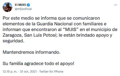 Luego de varias horas de haber sido reportado como desaparecido, la tarde de hoy domingo se informó que Pedro Carrizales, “El Mijis”, fue localizado en el municipio de Zaragoza. A través de un mensaje en sus redes sociales, se detalló que “El Mijis” está recibiendo apoyo y seguridad por parte de elementos de la Guardia Nacional, sin dar mayor información al respecto.Ayer sábado, también a través de redes sociales, se informó que "El Mijis" había desaparecido luego de ir a protestar a un concierto de Lalo Mora, señalado de abuso sexual tras haber manoseado a varias fans.De acuerdo al mensaje escrito en su cuenta de Twitter, el legislador previamente había recibido amenazas, sin embargo, después de las 21:30 horas del sábado no se supo de su paradero.En días pasados, "El Mijis" denunció al cantante Lalo Mora por abuso sexual en contra de varias mujeres.GC