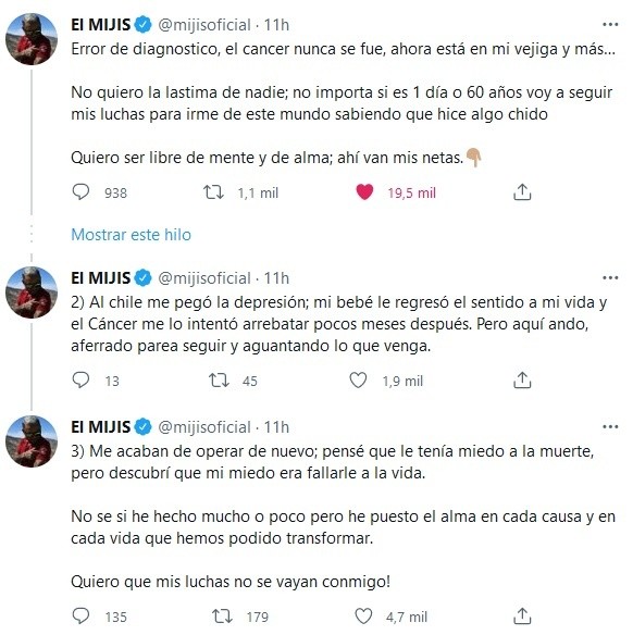 Pedro Carrizales, el "Mijis", dio a conocer este martes que el cáncer por el que fue tratado durante año y tres meses, y del que fue operado en septiembre de 2020, "nunca se fue".El diputado de San Luis Potosí indicó en diciembre pasado que había vencido al cáncer luego de entrar a cirugía, sin embargo, esta noche lamentó un error en el diagnóstico, por lo que ya fue operado de nuevo.A través de sus redes sociales, Carrizales manifestó que su cáncer se ha expandido a su vejiga "y más", pero aseguró, va a seguir sus luchas mientras tenga vida. "Para irme de este mundo sabiendo que hice algo chido", escribió.Por esta razón, dijo, compartiría algunas "netas" con sus seguidores bajo la idea de "ser libre de mente". En estas, Carrizales habló de su depresión, de su nueva operación contra el cáncer y sobre su candidatura a diputado federal por Morena. Sobre esta última, el postosino refirió que su candidatura, la cual fue negada por el Tribunal Electoral luego de determinar que el "Mijis" no cumplió con los requisitos para representar a la población indígena, fue echada abajo por culpa del secretario general del partido en San Luis Potosí.Aseguró que no fingió ser originario de un pueblo indígena, pues su padre nació en la Huasteca Potosina y él vivió ahí durante su infancia, pero indicó que el secretario de Morena de la entidad se ofreció a hacer su registro como candidato para afectarlo y dejarlo fuera, pues, según aseveró, "falsificó documentos"."Le tocará rendir cuentas con la fiscalía. Todo cae con el tiempo. No lo dije antes para no chingar a quienes creen en mí", agregó.OA