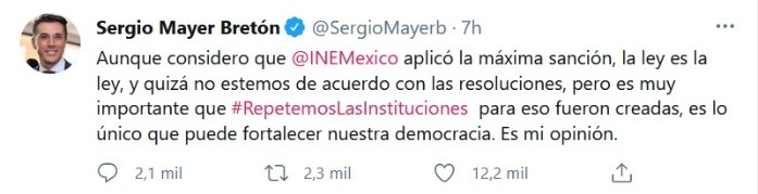 Luego de que el Instituto Nacional Electoral (INE) resolviera quitarle la candidatura a Félix Salgado Macedonio como gobernador de Guerrero por no haber presentado informe de ingresos y gasto de precampaña, el diputado Sergio Mayer señaló que "la ley es la ley".A través de redes sociales, el presidente de la Comisión de Cultura y Cinematografía de la Cámara de Diputados consideró que el INE aplicó la máxima sanción a su también compañero de Morena."Aunque considero que INE aplicó la máxima sanción, la ley es la ley, y quizá no estemos de acuerdo con las resoluciones, pero es muy importante que #RepetemosLasInstituciones para eso fueron creadas, es lo único que puede fortalecer nuestra democracia", escribió Sergio Mayer en redes sociales. "Es mi opinión", agregó.Tras la resolución de INE, Félix Salgado Macedonio aseguró que respetará la decisión que tome el Tribunal Electoral del Poder Judicial de la Federación (TEPJF) sobre su candidatura."Respetaremos lo que el Tribunal Electoral decida. Es un compromiso con la democracia y con nuestra Patria. La 4T avanza sin descanso. Ya tenemos entumido nuestro cuerpo, sólo estamos avanzando con el corazón. Gracias México por tu apoyo"."¡Hay toro!", escribió el guerrerense este miércoles en redes sociales.JM