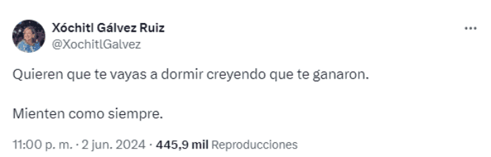 Todo México espera los resultados del Instituto Nacional Electoral (INE) para saber quién será la siguiente presidenta o presidente del país.Claudia Sheinbaum, Xóchitl Gálvez y Jorge Máynez son los candidatos por los cuales miles de mexicanos votaron en las urnas. Si bien en el Programa de Resultados Electorales Preliminares (PREP) Claudia Sheinbaum encabeza las encuestas, es el conteo rápido el que daría una probabilidad más factible de quién sería la ganadora o el ganador de la contienda electoral. Debido a distintas circunstancias, el conteo rápido del INE se ha estado posponiendo; en un principio se dijo que sería a las 22:00 horas, para ser movido a las 23:00, y postergado de nueva cuenta. Al respecto, Xóchitl Gálvez, candidata por la coalición Fuerza y Corazón por México, compartió unas palabras de indignación en su cuenta oficial de X, antes Twitter, sugiriendo que le parece sospechosa la demora. "Quieren que te vayas a dormir creyendo que te ganaron. Mienten como siempre", escribió la candidata. Se tiene previsto que el conteo rápido se realice a las 23:30 de la noche. FS