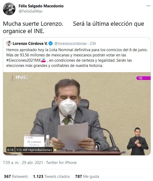 Félix Salgado Macedonio amagó al consejero presidente del Instituto Nacional Electoral (INE), Lorenzo Córdova, al señalar que será la última elección que organice el órgano electoral. Félix Salgado Macedonio escribió, a través de su cuenta de Twitter: "Mucha suerte Lorenzo, Será la última elección que organice el INE".La amenaza del morenista acontece luego que el Tribunal Electoral del Poder Judicial de la Federación (TEPJF) confirmó el pasado 27 de abril la suspensión de la candidatura de Félix Salgado Macedonio, aspirante de Morena a la gubernatura de Guerrero, por no haber dado a conocer sus gastos de precampaña.Por su parte, esta mañana, el Presidente Andrés Manuel López Obrador (AMLO) informó que presentará una reforma electoral al Poder Legislativo después de que los órganos autónomos cancelaron el registro de dos de sus candidatos de Morena en Michoacán y Guerrero.López Obrador acusó al TEPFJ y al INE de "violar los derechos" de Raúl Morón, quien quería ser gobernador de Michoacán, y Félix Salgado Macedonio, aspirante a gobernador de Guerrero, acusado de violación sexual.Ayer, Félix Salgado Macedonio anunció que denunciará ante la Corte Interamericana de Derechos Humanos (CIDH) la nulificación de su candidatura a la gubernatura de Guerrero, por Morena, pero lo hará de manera virtual y no asistiendo a la corte porque, dijo, "eso es lo que quisieran" sus opositores.Salgado Macedonio ha asegurado que Morena ganará las elecciones del próximo 6 de junio y pidió unidad a los simpatizantes del partido del Presidente López Obrador.OA
