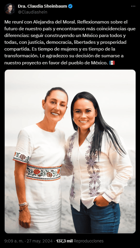 Este lunes, Alejandra del Moral Vela, excandidata del tricolor a la gubernatura del Estado de México, renunció al PRI.En una carta que hizo pública en sus redes sociales, dirigida al líder nacional del PRI, Alejandro Moreno, dijo que la actual dirigencia del partido "ha dejado de lado los ideales revolucionarios de democracia y justicia social".Claudia Sheinbaum informó en redes sociales que se reunió con Alejandra del Moral, con quien subió una foto."Reflexionamos sobre el futuro de nuestro país y encontramos más coincidencias que diferencias: seguir construyendo un México para todos y todas, con justicia, democracia, libertades y prosperidad compartida."Es tiempo de mujeres y es tiempo de la transformación. Le agradezco su decisión de sumarse a nuestro proyecto en favor del pueblo de México", escribió Claudia Sheinbaum.En febrero pasado, Del Moral Vela anunció que no participaría en el proceso electoral del 2 de junio, donde buscaría una curul por la vía plurinominal.A través de una carta dirigida al presidente nacional del Partido, declinó como candidata a diputada federal.En el 2023, Alejandra del Moral fue candidata a la gubernatura del Edomex por la coalición "Va por el Estado de México", conformada por PRI, PAN, PRD y Nueva Alianza, perdiendo la elección ante Delfina Gómez, de Morena.*Mantente al día con las noticias, únete a nuestro canal de WhatsAppOF