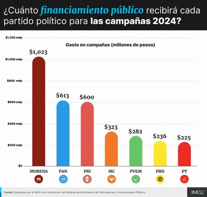 Las campañas electorales de los y las candidatas a un cargo de elección popular están a nada de comenzar. El próximo viernes 1 de marzo marca el inicio de la temporada en la que las propuestas y ofertas políticas inundarán México previo a las elecciones del 2 de junio, las más grandes de la historia del país.Vendrá una época amada por unos y odiada por otros, pero que sin lugar a dudas representa una coyuntura en la vida del país. Los partidos políticos se presentarán frente a la ciudadanía como opciones para gobernar y, para lograrlo, gozarán de recursos públicos y aquí te presentamos más detalles.Según el Instituto Mexicano para la Competitividad (IMCO), las campañas implicarán un financiamiento público total de 3 mil millones de pesos, pero distribuidos de manera diferenciada para cada partido.El Instituto Nacional Electoral (INE) informó que en total se elegirán más de 19 mil cargos, entre ellos: elección de gubernaturas, jefatura de gobierno de la Ciudad de México, congresos locales, ayuntamientos, juntas municipales y alcaldías.Además, el Proceso Electoral 2023-2024 trae consigo la elección de Presidenta o Presidente de la República (1 cargo), senadoras y senadores (128 cargos), así como la elección de diputadas y diputados de la Cámara Baja (500 cargos).*Mantente al día con las noticias, únete a nuestro canal de WhatsApp aquí: https://whatsapp.com/channel/0029VaAf9Pu9hXF1EJ561i03MV