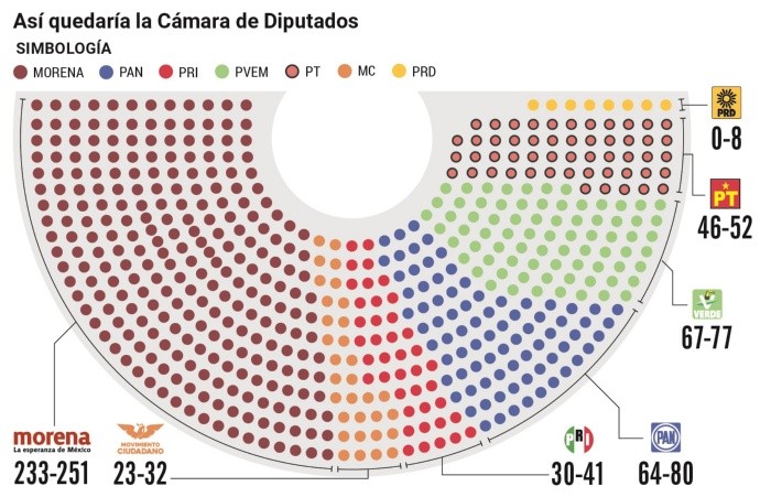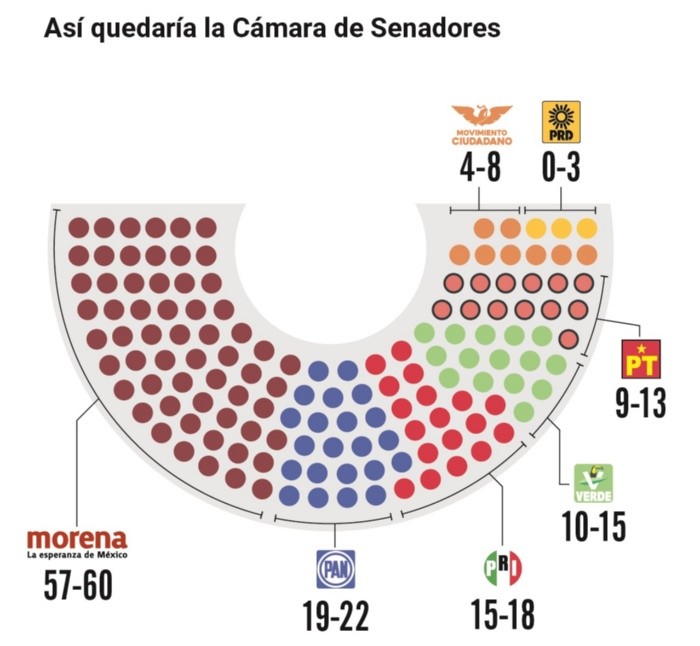 La coalición que conformaron Morena, el Partido del Trabajo (PT) y el Partido Verde Ecologista de México (PVEM) se perfila para tener mayoría calificada en el Congreso de la Unión, de acuerdo con los resultados revelados por el conteo rápido del Instituto Nacional Electoral (INE). Esto permitiría que dichas fuerzas políticas puedan llevar a cabo reformas constitucionales para hacer ajustes importantes en organismos autónomos como el mismo INE, el Instituto Nacional de Transparencia, Acceso a la Información y Protección de Datos Personales (Inai) y la Suprema Corte de Justicia de la Nación (SCJN), entre otras medidas.En el Senado, dicha alianza política podría tener entre 76 y 88 espacios, mientras que en la Cámara de Diputados tendría desde 346 hasta 380. Para Luis Carlos Ugalde, extitular del Instituto Federal Electoral (IFE, ahora INE), con estos resultados “podrá avanzar Plan C”, que prometió el Presidente Andrés Manuel López Obrador (AMLO) luego de que ministros de la Corte y miembros de la oposición frenaron sus planes para debilitar al INE, lo que causó que ciudadanos y miembros de la oposición llevaran a cabo manifestaciones para rechazar dichos planes.Otras iniciativas bateadas fueron la reforma eléctrica y la que buscaba que la Guardia Nacional quedara en manos del Ejército. Movimiento de Regeneración Nacional (Morena) y partidos aliados estarían con la mayoría en el Congreso mexicano de acuerdo con las elecciones de ayer y según los resultados del conteo rápido que dio a conocer en los primeros minutos de este lunes el Instituto Nacional Electoral (INE).Guadalupe Taddei, presidenta del INE, reveló que tras la estimación preliminar tras el conteo de mil 90 de los centros de votación, que representan el 67.3% de las muestras del total del país con nivel de confianza de 95%, Morena, partido del Presidente Andrés Manuel López Obrador, habría conseguido entre 41.9% y 44% de la votación para la Cámara de Senadores (Cámara Alta), lo que representa entre 57 y 60 senadurías.En tanto, el Partido Acción Nacional (PAN) habría obtenido entre el 15.8% y el 17.9%, que es entre 19 y 22 senadurías, mientras que el Partido Revolucionario Institucional (PRI) logró entre el 10.7% y el 1.3%, lo que representa entre 15 y 18 senadurías.En tanto, sobre los aliados de Morena, el Partido Verde Ecologista de México (PVEM) obtuvo entre 8.6% y 9.8%, lo que representa entre 9 y 13 senadurías. Por su parte, el Partido del Trabajo (PT), consiguió entre 5.3% y 6.5% de los sufragios: de 9 a 13 senadurías.Con estos resultados, la coalición Sigamos Haciendo Historia, conformada por Morena, PT y PVEM, contaría con entre 57 y 60 senadores, con lo que lograría mayoría en el Senado.Finalmente, Movimiento Ciudadano se llevó entre el 10.9 y el 12%, lo que representa entre 4 y 8 senadurías.En cuanto a la Cámara de Diputados, la estimación se realizó en tres mil 107 centros de votación, lo que representa un 67.3% de la muestra total, con un nivel de confianza de 95% y arrojó para Morena entre el 41.2% y 42.8% de la votación, entre 233 y 251 diputaciones.En tanto, el PVEM logró entre 8.1% y 9.1% de la votación entre 67 y 77 diputaciones, y el PT se hizo de entre 5.3% y 6.1% de los votos, que representan entre 46 y 52 diputaciones.Con ello, la alianza oficialista lograría la mayoría calificada en la Cámara de Diputados; es decir, más de dos terceras partes de los diputados, con entre 346 y 380 legisladores.El opositor PAN alcanzó entre el 17.3% y 18.7%, que representa entre 64 y 80 diputaciones; en tanto el PRI consiguió entre el 11.1% y 11.9%, con lo que tendría entre 30 y 41 diputaciones; mientras que el PRD se hizo de entre 2.4% y 3.1%, para lograr entre 0 y 8 diputaciones.MC se habría quedado con entre 11.1% y 12% de la votación, lo que le daría entre 23 y 32 diputaciones. Taddei aclaró que estos resultados son preliminares y están sujetos a confirmación de los cómputos distritales que comenzarán el próximo miércoles 5 de junio; sin embargo, recalcó que representan “una proyección robusta de la voluntad expresada en las urnas por el electorado mexicano”.La mayoría calificada toma especial relevancia porque con ello se podría garantizar la aprobación de las reformas pendientes del Presidente López Obrador.EFELíderes parlamentarios en el Congreso de la Unión mexicano, celebraron el desarrollo de la jornada electoral.Marcela Guerra Castillo, presidenta de la Cámara de Diputados, votó en Monterrey, Nuevo León, en una casilla ubicada en el Centro Universitario Franco Mexicano (CUFM). La legisladora priista se formó durante una hora y media para poder emitir su sufragio, por lo que aseguró que las largas filas son síntoma de una votación histórica.“Esto quiere decir que la gente está saliendo, que vamos a rebasar un porcentaje quizá superior al histórico reciente. Y eso significa democracia, eso significa libertad, eso significa salir a votar en paz y ejercer nuestra voluntad ciudadana a través del voto”, declaró.Jorge Romero, coordinador del PAN en San Lázaro y presidente de la Junta de Coordinación Política (Jucopo) en la cámara baja, hizo lo propio en la Ciudad de México, en una casilla ubicada en la alcaldía Benito Juárez.Tras emitir su voto, compartió una imagen acompañada del texto: “Listo. Todos a votar!”El líder de las y los diputados federales de Morena, Ignacio Mier, votó en Cholula, Puebla, lo hizo en punto de las 10 horas en una casilla ubicada en la escuela primaria Leona Vicario.Francisco Huacus, coordinador del PRD, votó en Apatzingán, Michoacán. Lo hizo desde las 10 horas en una casilla ubicada en el Jardín de niños El Papalote.“En Michoacán somos partícipes de la fiesta democrática, votar es nuestro poder; el poder que hoy tenemos los mexicanos de decidir. Defendamos a nuestro país. ¡Votar es de chi...!”, escribió en su red social X.Braulio López Ochoa, coordinador d