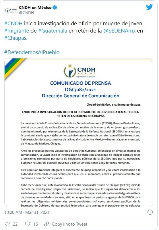 La Comisión Nacional de los Derechos Humanos (CNDH) realizará una investigación sobre el asesinato de Elvin Mazariegos Pérez, un migrante guatemalteco quien perdió la vida luego de que un elemento de la Secretaría de la Defensa Nacional (Sedena) le disparó en un retén ubicado en los límites de Chiapas y Guatemala, en el municipio Mazapa de Madero.La CNDH abrió un expediente de queja de oficio para indagar el abuso cometido por el personal militar en contra del migrante, quien no cometió ningún tipo de agresión contra los elementos de seguridad previo al disparo que recibió."Ante los presuntos hechos violatorios de derechos humanos, difundidos en diversos medios de comunicación, la CNDH inició la investigación de oficio con la finalidad de indagar posibles actos u omisiones cometidos por parte de servidores públicos de la Sedena, que por su naturaleza pudieran resultar de especial gravedad y constituir violaciones a los derechos humanos", señaló la CNDH en un comunicado de prensa.Estos hechos ocurridos el lunes pasado ya fueron lamentados incluso por el secretario de la Defensa Nacional, Luis Cresencio Sandoval, quien admitió que el militar que realizó el disparo contra el migrante tuvo una "reacción errónea". Frente a estos hechos, la CNDH expresó que entrará en contacto con la Sedena para allegarse de más elementos en su investigación."Esta Comisión Nacional integrará el expediente de queja respectivo y solicitará información a la autoridad involucrada en los hechos para que, en su momento, emita el pronunciamiento que conforme a derecho corresponda", agregó la CNDH.JM