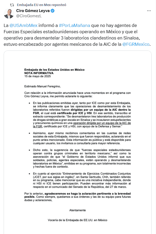 La Embajada de Estados Unidos en México respondió este jueves 15 de mayo al negar que agentes de ese país colaboren en operativos contra el narcotráfico en territorio mexicano, y aseguró que esas acusaciones son "incorrectas" y hechas fuera de "contexto" tras la polémica por una foto publicada en sus redes sociales.En una nota informativa, enviada al periodista Ciro Gómez Leyva, quien retomó la información sobre un desmantelamiento de laboratorios clandestinos en Sinaloa, la Embajada aclaró que sí se realizaron estas acciones, pero que el operativo fue encabezado por la Agencia de Investigación Criminal (AIC) de la Fiscalía de la República (FGR)."En ese sentido, transcribo el extracto correspondiente: 'Se desmantelaron tres laboratorios de producción de drogas sintéticas a gran escala en Sinaloa y se incautaron estupefacientes y precursores químicos en una operación dirigida por un equipo de la AIC de la FGR, certificado por ICE (Servicio de Control de Inmigración y Aduanas) y HSI (Oficina de Investigaciones de Seguridad Nacional), con apoyo de la (Secretaría de la) Defensa y Semar (Secretaría de Marina)'", subrayó el comunicado.Ante ello, la embajada estadounidense rechazó la sugerencia de que fuerzas especiales estadounidenses operan contra grupos criminales en territorio mexicano, al señalar que esas acusaciones "son incorrectas y están hechas fuera de contexto".La aclaración ocurre luego de que durante "La Mañanera del Pueblo", la Presidenta Claudia Sheinbaum negara los reportes que aseguraban que la embajada había publicado una fotografía donde, supuestamente, se observaba a agentes estadounidenses colaborando en el operativo de desmantelamiento."Es falsa. Esa fotografía que sale en primera plana de (periódico) … No corresponde a ninguna operación en México", enfatizó la Mandataria.Asimismo, recordó que desde el sexenio del expresidente Andrés Manuel López Obrador (2018-2024) se legisló para que ningún extranjero pudiera participar en algún operativo en territorio mexicano y pidió aclarar de dónde había salido la fotografía.El tráfico de drogas ha sido un tema crítico entre México y Estados Unidos desde la llegada de Donald Trump a su segundo mandato, pues el gobernante estadounidense ha aumentado la presión sobre México, al asegurar que no hace lo suficiente para combatir el tráfico de drogas, especialmente de fentanilo.Asimismo, Washington incluyó en la lista oficial de terrorismo a seis grupos del narcotráfico de México: el Cártel Nueva Generación (CNG), el de Sinaloa, del Golfo, del Noroeste, la Familia Michoacana y los Cárteles Unidos.*Mantente al día con las noticias, únete a nuestro canal de WhatsAppOF