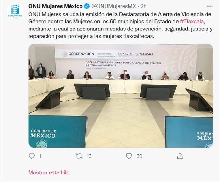 Este miércoles, la Secretaría de Gobernación (Segob) emitió una declaratoria de alerta por violencia de género en el estado de Tlaxcala, para erradicar cualquier agresión contra las mujeres.Ante esto, la secretaria de Gobernación, Olga Sánchez Cordero, aseguró que una de sus prioridades es enfrentar la violencia contra las mujeres. Además, adelantó que trabajará en coordinación con las autoridades estatales para abatir esta práctica.Esta declaratoria de alerta de género es resultado de una petición de la organización Mujeres del Tercer Milenio, que evidenció las condiciones de violencia contra el género femenino que se profundizaron durante la pandemia de COVID-19.En una ceremonia que organizó esta dependencia para emitir la alerta, Fabiola Alanís, titular de la Comisión Nacional para Prevenir y Erradicar la Violencia contra las Mujeres (Conavim), explicó que una de las causas de la violencia es la desigualdad por razones de género, por ello, llamó a eliminar las prácticas que "reproducen la dominación, explotación y violencia contra las mujeres".Además, detalló que una de cada cinco estudiantes es violentada en su escuela y una de cada tres mujeres en la calle. "En el último año se registran 76 casos de feminicidios que no han sido investigados como tales", dijo.Por su parte, Nadine Gasman, presidenta del Inmujeres México, sostuvo que el propósito es implantar acciones de prevención, atención, sanción y erradicación de la violencia, "en lugares donde antes no era visibilizada ni consideraba esta problemática con la contundencia requerida".Mientras que el subsecretario de Derechos Humanos, Población y Migración, Alejandro Encinas, afirmó en el encuentro que aunque esta alerta no va a resolver el problema de fondo, este es un paso muy importante, ya que más del 60% de los actos de violencia se cometen dentro del hogar; "se necesita actuar en los espacios públicos y dentro de los hogares", señaló.Precisó además, que en materia de violencia de género, Tlaxcala tiene particularidades, las cuales están definidas por 76 feminicidios en el último año y por los casos de trata de personas para la explotación sexual forzada.Si te interesó esta noticia y quieres saber más, entonces descarga y descubre INFORMAPlus, la aplicación digital de EL INFORMADOR, en donde tenemos contenidos exclusivos, seleccionados por nuestros editores, para darles una experiencia más completa a los lectores. Si eres suscriptor de EL INFORMADOR tu acceso está incluido, solicítalo al 33 3678-7777Descarga la aplicación y pruébala GRATIS por treinta días.Para iOS: https://apple.co/35jaVgbPara Android: https://bit.ly/3gwVSEVJM
