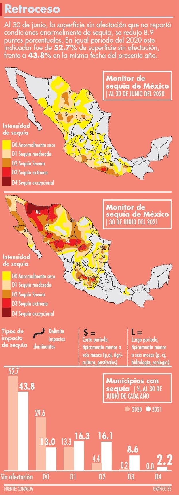 En el último año incrementó 25.4 puntos porcentuales la superficie del país que permanece en algún grado de sequía: moderada, severa, extrema y excepcional. En ese mismo periodo, 11 estados aumentaron la superficie con afectaciones, en tanto, 15 lo disminuyeron.Resalta que las lluvias presentadas en la última quincena de junio han permitido una recuperación de la superficie que registraba afectaciones por sequedad en el país, expone información de la Comisión Nacional del Agua (Conagua), con base en reportes del Monitor de Sequía y del Servicio Meteorológico Nacional (SMN).Al 30 de junio del presente año, 43.2% de la superficie del país presentó algún grado de sequía, porcentaje superior al reportado en igual lapso del 2020, cuando rondaba en 17.8% de la superficie.Mientras el porcentaje de superficie anormalmente seco se redujo de 29.6% a 13% al 30 de junio del año en curso.En el periodo de referencia, la superficie sin afectación en México, es decir, que no reportó condiciones anormalmente secas o de sequía, se redujo 8.9 puntos porcentuales, debido a que al 30 de junio del 2020 este indicador fue de 52.7% de superficie sin afectación, frente a 43.8% en la misma fecha del presente año.Durante los últimos 12 meses, la superficie en condiciones de anormalmente seco se redujo 16.5 puntos porcentuales (pasó de 29.6 a 13%); la sequía moderada incrementó tres puntos porcentuales (13.3 a 16.3%); la sequía severa creció 11.7 puntos (4.4 a 16.1%); la sequía extrema avanzó 8.4 puntos (0.2 a 8.6%); y sequía excepcional aumentó 2.2 puntos (de 0 a 2.2 por ciento).El porcentaje de municipios en sequía disminuyó en el último año, debido a que hasta el 30 de junio del 2020 eran 633 municipios con algún tipo de sequía (25.7% de las 2,463 demarcaciones), mientras tanto, para el 30 de junio del 2021 fueron 513 municipios (20.8% del total).También en el último año, entre las 32 entidades federativas, se observó un crecimiento en el número de estados que reportaron 100% de su superficie sin afectación por sequía.Mientras en el 2019 no se tenía registro de entidades que tuvieran la totalidad de superficie sin afectación, en el 2020 fueron ocho estados con 100% de superficie sin afectación: Baja California, Baja California Sur, Campeche, Chiapas, Ciudad de México, Quintana Roo, Tabasco y Yucatán.Para el 30 de junio del 2021, fueron 10 las entidades con 100% de su área sin afectación: Campeche, Colima, Chiapas, Ciudad de México, Morelos, Puebla, Quintana Roo, Tabasco, Tlaxcala y Yucatán.Con tendencia descendente, 15 entidadesEn el último año, 11 estados incrementaron el porcentaje de superficie con afectaciones por condiciones de anormalmente seco o por tener algún grado de sequía. Estas entidades federativas fueron: Coahuila (alza de 0.9 puntos porcentuales), San Luis Potosí (6.6 puntos), Guanajuato (9.3 puntos), Chihuahua (15.2 puntos), Aguascalientes (18.7 puntos), Nuevo León (28.8 puntos), Zacatecas (34.1 puntos), Tamaulipas (64.7 puntos), Baja California Sur (76.0 puntos), Sonora (86.7 puntos) y Baja California (100 puntos porcentuales).En contraste, en 15 estados se redujo el porcentaje de superficie con algún grado de afectación: Tlaxcala (-97.9 puntos porcentuales), Colima (-97.3 puntos), Guerrero (-81.5 puntos), Oaxaca (-73.3 puntos), Nayarit (-68.4 puntos), Morelos (-61.4 puntos), Puebla (-46.3 puntos), Jalisco (-40.2 puntos), Estado de México (-38.8 puntos), Michoacán (-26.7 puntos), Hidalgo (-22.8 puntos), Sinaloa (-14.6 puntos), Querétaro (-13.6 puntos), Durango (-9.6 puntos) y Veracruz (-6.7 puntos porcentuales).Y las seis entidades restantes no reportaron variación en la superficie sin afectaciones: Campeche, Chiapas, Ciudad de México, Quintana Roo, Tabasco y Yucatán.Incremento en el área afectada de las cuencasDe acuerdo con reportes de los 13 organismos de cuencas de la Conagua, en los que está segmentado el territorio nacional, en el transcurso de un año, en cinco organismos se reportó incremento en el área afectada, es decir, que tiene algún grado del rango de condiciones anormalmente seco, sequía moderada, sequía severa, sequía extrema o sequía excepcional: Pacífico Sur (aumentó 88.7 puntos porcentuales), Balsas (87.6), Aguas del Valle de México (39.0), Golfo Centro (10.2) y Lerma-Santiago-Pacífico (6.4).Mientras en seis se redujo el porcentaje de superficie con algún tipo de afectación: Península de Yucatán (-12.2 puntos porcentuales), Río Bravo (-20.7), Cuencas Centrales del Norte (-20.8), Golfo Norte (-45.1), Noroeste (-58.0) y Península de Baja California (-91.8). Y sólo en dos no hubo variaciones en el último año: Pacífico Norte y Frontera Sur.Los efectos del cambio climático han acelerado los procesos de sequía y por ende, han impactado el almacenamiento en los cuerpos de agua, explicó Pablo Talamantes Contreras, secretario técnico del Colegio de Ingenieros Civiles de Querétaro (CICQ).