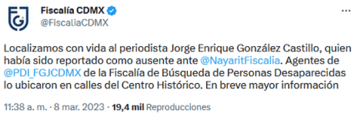 La Fiscalía General de Justicia de la Ciudad de México informó que localizó con vida al director del periódico Meridiano, de Nayarit, Jorge Enrique González Castillo, de 63 años, quien fue reportado como desaparecido desde el martes 7 de marzo.La Fiscalía de Nayarit emitió una ficha de búsqueda para localizar al director general del medio de comunicación, quien el lunes viajó a la capital del país para reunirse con integrantes de la agencia de publicidad del periódico.Según el reporte de la desaparición de González Castillo, desde la mañana del martes no se le había logrado localizar, por lo que se levantó una denuncia ante la Fiscalía de Nayarit para que a través de esta se pidiera el apoyo de las autoridades de la Ciudad de México.OA