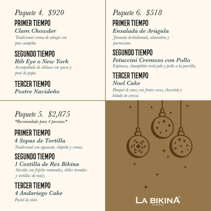 Al momento de ir a un restaurante, la gente es consciente de que va a pagar un poco más debido a la inflación, el servicio y la exclusividad del menú... Sin embargo, cuando se trata de platillos muy básicos y tradicionales como un plato de frijoles o una sopa de tortilla, no pensamos que éstos podrían costar más que un corte de carne.A través de su página oficial, el restaurante "La Bikina" se volvió viral tras publicar el descuento que tendrían durante el mes de las posadas para todas las personas que desearan degustar su menú de tres tiempos con un valor de casi tres mil pesos.Lo interesante fue la reacción de los cibernautas al ver el precio que manejaba el restaurante de cocina tradicional mexicana chihuahuense, pues lo consideraron "exagerado" pese a que tenía un descuento al ser temporada navideña.El restaurante La Bikina está ubicado entre Periférico de la Juventud y Avenida Paseos Vistas del Sol, Chihuahua.Entre los pequeños menús que el restaurante compartió en su página de Facebook a manera de publicidad destacaron seis, pero el que llamó la atención de los usuarios fue el "menú 5", el cual debía ser reservado con previa anticipación. Éste consistía en una sopa de tortilla, frijoles con costilla de res bikina y guarnición de chiles toreados; finalmente, de postre sirven un pastel de elote. Esto se ofrece a un precio de dos mil 875 pesos.En algunos comentarios le preguntaron al restaurante cuántos comensales estaban incluidos en el menú, a lo que La Bikina respondió que el costo era por persona. No obstante, días después rectificaron que el "menú 5" se sugería para cuatro personas, lo que generó comentarios de burla e incluso memes debido a lo elevado de los precios y lo básico de la comida ofrecida.JM