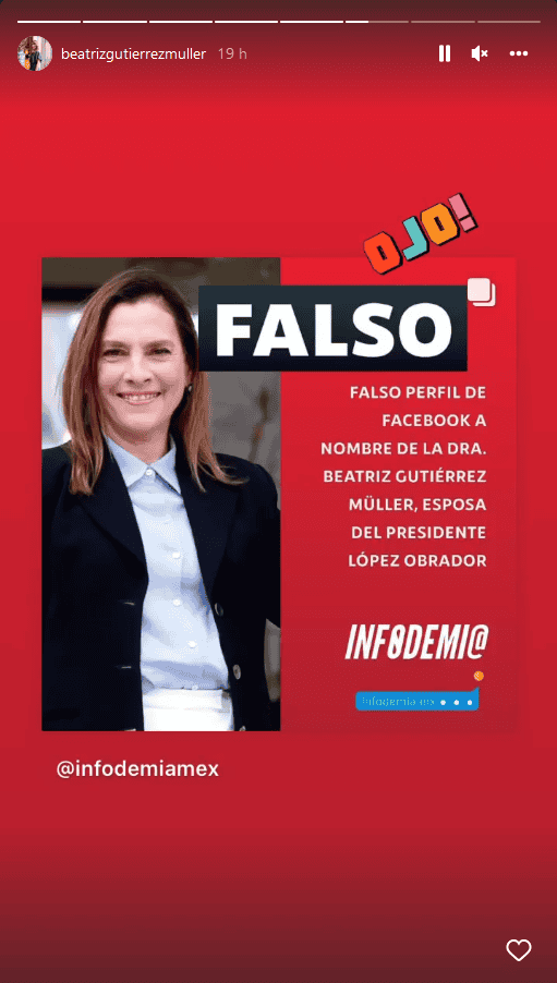 A través de redes sociales, la doctora Beatriz Gutiérrez Müller compartió una publicación de alerta sobre un Facebook falso a su nombre que ofrece premios en efectivo.La esposa del Presidente Andrés Manuel López Obrador compartió en su cuenta de Instagram la publicación de Infodemia MX: "Ojo!", "FALSO".Infodemia Mx, iniciativa del Sistema Público de Radiodifusión del Estado Mexicano, indicó que el perfil falso de "Beatriz Gutiérrez Sorteo" ofrece premios en efectivo, "pero es un fraude".Se recordó que el perfil verificado de la doctora Gutiérrez Müller es: facebook.com/BGutierrezMuller.OA