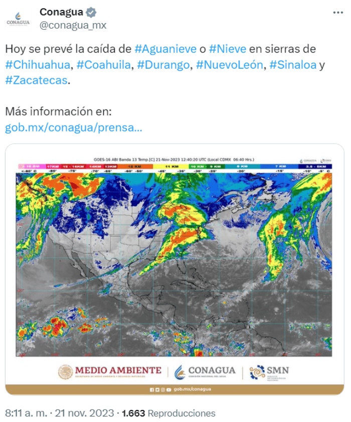 La Comisión Nacional del Agua (CONAGUA) ha previsto algunas condiciones climáticas invernales con la probabilidad de caída de aguanieve o nieve en diversos estados del país a lo largo de los siguientes días.Desde el día de hoy se preveé que la temperatura tenga un descenso de hasta -5°C en Baja California, Sonora, Chihuahua y Durango. Incluso se pronosticó la posibilidad de caída de nieve o aguanieve en las sierras de Chihuahua, Durango, Sinaloa, Zacatecas, Coahuila y Nuevo León. A lo anterior también se suma la posibilidad de chubascos en regiones de Chihuahua, Sinaloa, Durango, Zacatecas y Aguscalientes. El frente frío 11, que propicia estas condiciones climáticas, avanzará por el oriente, centro y sureste del país.Durante el miércoles 22 de noviembre, dicho frente frío tendrá una extensión hacia el sureste y la Península de Yucatán y, además, la primera tormenta invernal de la temporada tendrá lugar en Coahuila, Nuevo León, Tamaulipas, San Luis Potosí, Aguascalientes, Zacatecas y Durango.Por otro lado, el jueves 23 de noviembre se trasladará hacia el Golfo de México y el sureste del país con lluvias en diversas zonas. El desplazamiento continuará hacia Estados Unidos, pero podría aparecer la aguanieve o nieve en Coahuila y Nuevo León.SV