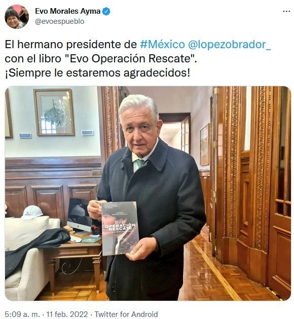 Evo Morales, expresidente de Bolivia, arrancó la jornada de este viernes recordando al "hermano" Andrés Manuel López Obrador (AMLO) y agradeciéndole el asilo político que le otorgó en noviembre de 2019.Evo Morales difundió en redes sociales una fotografía de AMLO en Palacio Nacional sosteniendo el libro "Evo Operación Rescate" de Alfredo Serrano, el cual relata el proceso que vivió el político sudamericano durante un año, desde su renuncia forzada a la presidencia, su rescate por parte del Gobierno mexicano y su regreso a Bolivia.En su cuenta de Twitter, Evo Morales escribió que siempre estará agradecido con López Obrador por ofrecerle asilo político y haber enviado un avión de la Fuerza Aérea Mexicana (FAM) a Bolivia para traerlo a México."El hermano presidente de México Andrés Manuel López Obrador con el libro 'Evo Operación Rescate'. Siempre le estaremos agradecidos!", escribió el exmandatario en la red social.El libro "Evo Operación Rescate" es una crónica que detalla la intimidad de los 365 días transcurridos desde la forzada renuncia de Evo Morales en noviembre de 2019 y su rescate clandestino por parte del gobierno mexicano hasta su regreso a su país en noviembre de 2020.El libro está documentado con materiales inéditos y con prólogo de Alberto Fernández, presidente de Argentina, y del propio Evo.OA