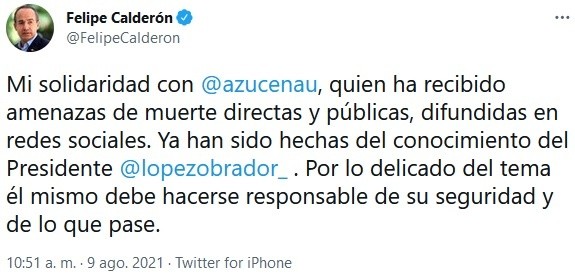 El Cártel Nueva Generación (CNG) amenazó a medios de comunicación, y directamente a la periodista Azucena Uresti, por la cobertura que realizan en Michoacán, donde esa organización genera violencia en su disputa con otro grupo armado.A través de un video, el CNG, encabezado por Nemesio Rubén Oseguera Cervantes "El Mencho" señaló sus "respetos para los noticiarios que hacen valer la libertad de expresión", pero exigió que "no protejan en sus noticias" y que "sean parejos porque yo no estoy en contra de la libertad de expresión".El video está "firmado" por Rubén Oseguera Cervantes y acusa a Juan Farías Álvarez "El Abuelo Farías" y a Hipólito Mora de no ser autodefensas, sino extorsionadores y delincuentes.Asimismo, en el video se amenaza a la periodista Azucena Uresti: "Azucena Uresti donde sea que estés, doy contigo y te haré que te comas tus palabras aunque me acusen de feminicidio, porque no me conocen a mí, Rubén Oseguera Cervantes, yo no soy cobracuotas ni extorsiono".Héctor de Mauleón expresó su solidaridad con Uresti y pidió al Presidente Andrés Manuel López Obrador (AMLO) que no deje pasar la amenaza."Aquí no caben los discursos ni los abrazos. Debe usted garantizar a toda costa la seguridad y la libertad de expresión de esta periodista", escribió De Mauleón en redes sociales."Mi solidaridad con Azucena Uresti, quien ha recibido amenazas de muerte directas y públicas, difundidas en redes sociales. Ya han sido hechas del conocimiento del Presidente López Obrador. Por lo delicado del tema él mismo debe hacerse responsable de su seguridad y de lo que pase", refirió el expresidente Felipe Calderón."Esto es inaceptable: ¿qué hará el gobierno?", agregó el expresidente."Solidaridad absoluta con Azucena Uresti y su equipo. Protección, cuidado y respeto a la libertad de expresión", escribió Carlos Loret de Mola."Solicito al presidente López Obrador que ordene protección inmediata para la periodista Azucena Uresti ante amenaza de muerte de parte del crimen organizado", exigió la senadora Lilly Téllez.Por su lado, el perredista Fernando Belaunzarán se unió a la demanda y solicitó a López Obrador que proteja a la periodista. "¡Te abrazo fuerte, Azucena!", expresó.Raúl Trejo Delarbre, investigador en temas de Ciencias Sociales y experto en medios, calificó de "gravísima, inaceptable e insoslayable" la amenaza contra Azucena Uresti."Expreso toda mi solidaridad con Azucena Uresti, esperando que las autoridades correspondientes hagan lo que toca para resguardar su integridad y así, la libertad de expresión de las y los periodistas mexicanos", refirió la conductora de noticias Mónica Garza."Mi apoyo y solidaridad es para Azucena Uresti porque ha dado más pruebas de su integridad y profesionalismo que su acusador. Por mucho", escribió el periodista Alberto Tavira, director de Cuna de Grillos.Otros que expresaron su solidaridad fueron el exsenador Javier Lozano, las periodistas Lourdes Mendoza, Ana Francisca Vega, Ana Paula Ordorica, Fernanda Familiar, Gabriela Warketin y Laura Sánchez Ley, así como los medios Sopitas y Publimetro.Ante las amenazas, Jesús Ramírez Cuevas, vocero del presidente López Obrador, señaló que el Gobierno tomará medidas pertinentes para proteger a medios y periodistas."Las libertades democráticas están garantizadas junto con el derecho a la información para los ciudadanos", expresó.Si te interesó esta noticia y quieres saber más, entonces descarga y descubre INFORMAPlus, la aplicación digital de EL INFORMADOR, en donde tenemos contenidos exclusivos, seleccionados por nuestros editores, para darles una experiencia más completa a los lectores.Descarga la aplicación y pruébala GRATIS por treinta días.Para iOS: https://apple.co/35jaVgb Para Android: https://bit.ly/3gwVSEVSi eres suscriptor de EL INFORMADOR tu acceso está incluido, solicítalo al 33 3678-7777OA