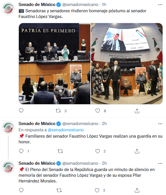 "Cuando era niño me asustaba morirme, me asustaba la muerte y pensaba yo en la astronomía y en la medicina, y cuando yo tenía como seis o siete años pensaba voy a descubrir algo para la vida eterna, para nunca morir", expuso el senador Faustino López Vargas en un video transmitido en el Senado en el marco de un homenaje póstumo.Con la presencia de sus 10 hijos, algunos menores de edad, se recordó al senador de Morena, quien murió junto con su esposa, Pilar Hernández Morales, el sábado pasado en un accidente automovilístico cuando se dirigían a Zacatecas al informe de actividades legislativas de su compañera de bancada Soledad Luévano.Una gran fotografía del legislador por Morena y un crespón negro en señal de luto, a los lados, dos arreglos de gladiolas blancas, fueron el escenario del homenaje en el Salón de Plenos al médico de profesión que arribó a la Cámara Alta como suplente del hoy gobernador de Tamaulipas, Américo Villarreal.Diego, Pilar, Faustino Eduardo, Debent Sara, Frida, Manuel, Francisco Javier, Gioconda y Paola, escucharon las condolencias y discursos de senadores de todas las bancadas y la propuesta de Dante Delgado de crear un fideicomiso, con aportaciones de legisladores y del propio Senado para garantizar los estudios de los menores de edad.Margarita Valdés planteó que los 60 senadores de Morena donarán el equivalente a una semana de dieta para el apoyo de los hijos del senador fallecido.El presidente de la Junta de Coordinación Política, Ricardo Monreal, reveló que cuando llamó a Faustino López, entonces senador suplente, para integrarse a la Cámara Alta, le dijo que no quería ser senador porque prefería seguir ayudando a la gente en su estado, en Ciudad Victoria, en Tampico."Lo convencí diciéndole que eso lo podría hacer con más eficacia desde el Senado de la República y eso fue lo que lo convenció para seguir ayudando. Sus oficinas siempre estaban llenas de campesinos, de obreros, de estudiantes", expuso.El presidente del Senado, Alejandro Armenta, a nombre de la asamblea manifestó sus condolencias a los hijos del legislador por tan irreparable pérdida y pidió guardar un minuto de silencio. Una decena de senadores de todas las bancadas destacaron la labor de Faustino López como médico ejemplar, como legislador y como gestor social.Senadores de todos los partidos montaron guardias de honor a la memoria de Faustino López.OA