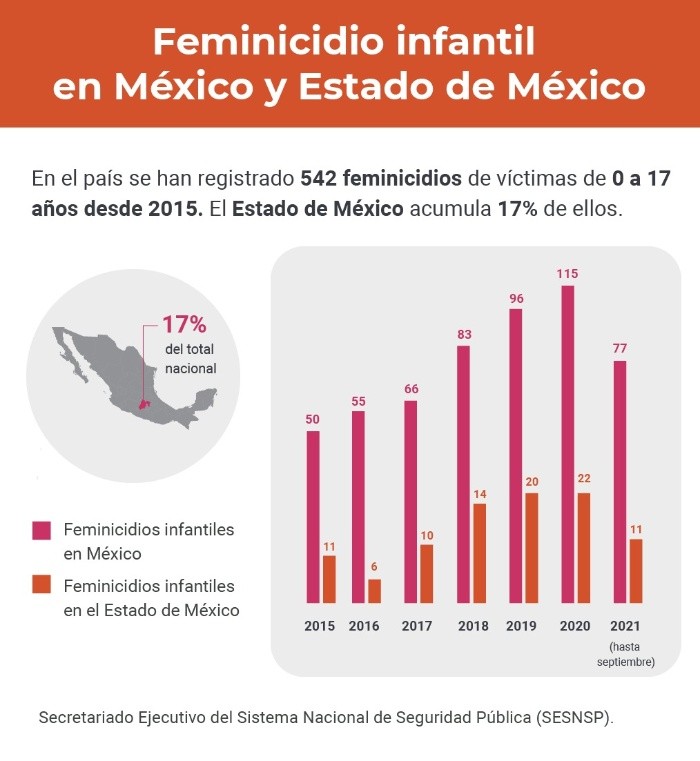 Por Celia GuerreroKaren Reyes había conseguido un segundo empleo luego de que las ventas de su negocio habían caído por la pandemia de COVID-19. Era domingo 29 de noviembre de 2020 y ese día debía ir a trabajar.La mujer de 31 años salió temprano de su domicilio en Ixtapaluca, Estado de México, y su hija Renata Martinely Luna, de 13 años, se quedó dormida. Cerca de ahí viven sus abuelos, así que Karen dejó a su hija, como en otras ocasiones, confiada de que estaría segura.Pero al regresar de su jornada de trabajo, encontró el cuerpo de Renata sobre su cama, con el rostro encintado y signos de violencia física y sexual. “Para mí hay un único y principal sospechoso”, dice Karen en entrevista.Se trata de su expareja, a quien en junio de 2020 había denunciado en la Agencia Especializada en Violencia Familiar, Sexual y de Género por intentar grabar un video de su hija, mientras se bañaba. La niña detectó el celular con el que pretendió grabarla, alertó a su mamá y al día siguiente ambas dejaron la casa en donde vivían con él.“Entregamos el video en un disco como prueba y nada más. Yo le dije: ‘Bueno, licenciada, y ¿qué sigue?’ Y simple y sencillamente me dijo: ‘No se preocupe, nosotros le vamos a dar seguimiento y ya cualquier cosa yo me comunico con usted’. Y ya fue todo”, cuenta Karen de aquella primera alerta que dio a las autoridades.Los funcionarios no volvieron a comunicarse con ella, ni la persona acusada fue citada a declarar. Pasaron cinco meses y Renata fue asesinada. Este 29 de noviembre de 2021 se cumple un año de su feminicidio, que, a la fecha, continúa impune.“Hay otros casos de feminicidio que (la sociedad) juzga porque una no va a denunciar, que se juzgan porque las chicas andaban en la calle, que se juzgan porque venían de una fiesta. Nosotros denunciamos, nos cambiamos de casa, mi hija estaba dormida ¿ahí qué pretexto hay?”, reclama Karen, quien sostiene la sospecha en contra de su expareja por el episodio de abuso y otras amenazas previas.ONU Mujeres califica a la violencia contra las mujeres y las niñas como una de las violaciones de los derechos humanos más graves, extendida, arraigada y tolerada en el mundo. Durante 2020, año del asesinato de Renata, México rompió récord de feminicidios de niñas y adolescentes: la cifra llegó a 115.“Estos casos que ha habido de niñas que han sido asesinadas de manera brutal, todas ellas tenían una violencia sistemática, no era la primera vez que sufrían algún tipo de violencia”, señala Yuritzi Castañeda, directora general de prevención y atención a la violencia de la Secretaría de las Mujeres del Estado de México.El caso de Renata fue uno de los 22 que sucedieron en el Estado de México, que en 2020 representaron cerca de 20% del total nacional, de acuerdo con el Secretariado Ejecutivo del Sistema Nacional de Seguridad Pública (SESNSP).“El primer año de este resguardo por pandemia, el feminicidio de niñas y mujeres adolescentes se incrementó brutalmente y durante 2021 la dinámica no cesó, se mantuvo. Este es uno de los efectos adversos del resguardo”, considera Tania Ramírez, directora de la Red por los Derechos de la Infancia en México (Redim).En México, los feminicidios de niñas y adolescentes de 0 a 17 años han incrementado año con año desde 2015, hasta llegar a sumar el total de 542 a septiembre de 2021, según el SESNSP.Ramírez habla de un incremento durante el resguardo por la pandemia debido a las características en los feminicidios infantiles detectadas por Redim: la mayoría de ellos suelen suceder a manos de varones, mayores de edad, que son familiares o personas cercanas a las víctimas. Considera que la convivencia en los domicilios durante el confinamiento pudo haber disparado los feminicidios infantiles en 2020.En la detección de estas características del feminicidio infantil coincide María de la Luz Estrada, coordinadora del Observatorio Ciudadano Nacional del Feminicidio (OCNF). “Las niñas viven en un contexto de violencia, que muchas veces ya fue denunciado y la autoridad no actúa para protegerlas”, añade.Aunque la problemática aumenta anualmente desde hace casi seis años, comenzó a señalarse hasta hace muy poco a través del término “feminicidio infantil”, que permite destacar aquellos casos donde las víctimas son mujeres menores de edad.“No es que sea un nuevo tipo (penal) pero es una aproximación distinta que nos ayudaría a entender la gravedad de la problemática. Una suerte de mezcla entre el feminicidio y el infanticidio”, explica Ramírez, directora de la Redim.En algunos estados el hecho de que la víctima sea menor de edad puede considerarse una agravante de feminicidio, aunque esto depende del código penal de cada entidad. Sin embargo, las autoridades no siempre tipifican este delito como feminicidio y puede que haya o no agravantes en caso de minoría de edad: “Prefieren llevarse esos casos a otras figuras jurídicas a tipificarlos como feminicidio”, sostiene Ana Yeli Garrido, abogada, directora de la organización Justicia Pro Persona.“Puede haber autoridades que no conciben los asesinatos de niñas como feminicidio. Ahí hay que decirles: las niñas también son mujeres. Hay una resistencia para acreditar el tipo penal en general y con las niñas ocurre al no considerarlas dentro de la categoría de mujer”, añade Garrido.Entonces, la invisibilización del feminicidio infantil conlleva a lo que Tania Ramírez, activista por los derechos de las infancias, llama “adultocentrismo institucionalizado”. Esta mirada adultocéntrica ocasiona que a las niñas, niños y adolescentes no se les reconozca como sujetos de derechos.Por ello, Yuritzi Castañeda, directora general de prevención y atención a la violencia, invita a que los feminicidios infantiles y otras violencias previas se miren desde la “interseccionalidad”. “Sí, se tiene que ver como una violencia de género, 