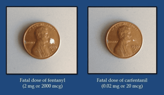 El fentanilo, como droga, produce efectos de relajación, euforia, confusión, somnolencia, mareos, náuseas, vómitos, constricción pupilar y depresión respiratoria, de acuerdo con la Drug Enforcement Administration (DEA).Hay muchos nombres con los que dicha droga se consigue en las calles de manera ilícita: apache, dance fever, friend, goodfellas, jackpot, tango, cash y murder 8, son algunos.Las personas adictas al opioide suelen ingerirlo por la nariz, fumado, inyectado, en pastillas, sobre papel secante, en parches que se colocan sobre la piel o líquido.Según detalla el National Institute on Drug Abuse (NIH), después de consumir fentanilo muchas veces, el cerebro se adapta a la sustancia y su sensibilidad disminuye, lo que hace que resulte difícil sentir placer con otra cosa que no sea la droga.En consecuencia, cuando una persona se vuelve adicta, la búsqueda y el consumo se apoderan de su vida.Como ocurre con cualquier otra droga, el abuso de fentanilo por placer puede provocar sobredosis con efectos secundarios graves y síntomas que ponen en peligro la vida.En el peor de los casos, tras el consumo, las personas adictas reducen la cantidad de oxígeno que llega al cerebro, provocando hipoxia. El trastorno lleva a un estado de coma, causa daños permanentes en el cerebro y hasta la muerte.De acuerdo con información de la NIH, 2 miligramos de fentanilo pueden ser letales para la mayoría de las personas.Una imagen compartida por la DEA muestra una comparativa entre una moneda de 1 centavo en Estados Unidos (penny) y la dosis que puede acabar con la vida de un ser humano.OA