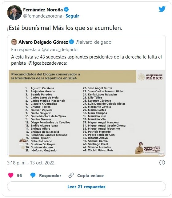 Gerardo Fernández Noroña, diputado del Partido del Trabajo y aspirante a la presidencia de 2024, reaccionó a la lista de “corcholatas” de la oposición que presentó la mañana de este jueves el Presidente Andrés Manuel López Obrador en su conferencia de prensa diaria.“¡Está buenísima! Más los que se acumulen”, escribió el controvertido legislador a través de Twitter, donde compartió la lista de los “presidenciables” opositores.Este jueves, López Obrador reveló la lista de 42 posibles candidatos de la oposición para contender por la Presidencia de la República en 2024.Como lo había prometido, el Mandatario “destapó” a los políticos, comunicadores y gobernadores que han sido señalados o han manifestado su interés de representar a los partidos de oposición en las próximas votaciones.La lista fue presentada en orden alfabético y fue leída por López Obrador en la conferencia matutina, mientras daba su opinión sobre algunos de los personajes.JM