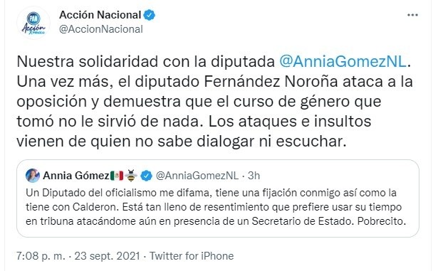 El legislador Gerardo Fernández Noroña encendió la sesión de hoy en la Cámara de Diputados al lanzar una seña obscena mientras recibía gritos de opositores.En el marco de la comparecencia del secretario de Hacienda, Rogelio Ramírez de la O, ante el Pleno de la Cámara de Diputados, el diputado del Partido del Trabajo (PT) intervino y desde la tribuna defendió las acciones del Gobierno de Andrés Manuel López Obrador (AMLO).Durante su intervención de más de 12 minutos, diputados panistas lo interrumpieron con gritos de “¡fuera, fuera!”, además de otros reclamos.Al referirse a los apoyos en alimentos a estudiantes de escuelas públicas, Fernández Noroña reprochó "la lechita y galleta pedorra" que se entregaban durante gobiernos panistas.Entre el continuo reclamo de diputados del PAN, se refirió al programa de guarderías de la administración pasada."Hablan de guarderías. Los niños ni se guardan. Me grita hipócrita alguien que me hacía así en la Legislatura pasada", expresó Fernández Noroña mientras hacía una seña con el dedo medio de la mano derecha.El petista se refería así a un reclamo que ya había hecho a Annia Sarahí Gómez, diputada del PAN en la anterior Legislatura y presente en la sesión de hoy, pues es también diputada para el periodo 2021-2024."Y yo le decía: compañera, está usted mal de artritis, la voy a mandar al Seguro Social para que la atiendan", añadió.La acción de Fernández Noroña levantó críticas entre los panistas."Un Diputado del oficialismo me difama, tiene una fijación conmigo así como la tiene con (el expresidente Felipe) Calderón. Está tan lleno de resentimiento que prefiere usar su tiempo en tribuna atacándome aún en presencia de un Secretario de Estado. Pobrecito", publicó más tarde Annia Sarahí Gómez en su cuenta de Twitter.El propio PAN expresó su solidaridad con Gómez a través de sus redes sociales: "Una vez más, el diputado Fernández Noroña ataca a la oposición y demuestra que el curso de género que tomó no le sirvió de nada. Los ataques e insultos vienen de quien no sabe dialogar ni escuchar". Luego de que se difundiera la información en varios medios, Fernández Noroña negó que la seña fuera para Sarahí Gómez."Falso. Justo lo que dije es que la diputada me hizo esta señal desde su curul en la legislatura pasada y que, hoy otra vez estaba insultando desde su curul", escribió en Twitter como comentario a una nota de refería que el gesto fue hacia la diputada panista.Si te interesó esta noticia y quieres saber más, entonces descarga y descubre INFORMAPlus, la aplicación digital de EL INFORMADOR, en donde tenemos contenidos exclusivos, seleccionados por nuestros editores, para darles una experiencia más completa a los lectores. Descarga la aplicación y pruébala GRATIS por treinta días. Para iOS: https://apple.co/35jaVgbPara Android: https://bit.ly/3gwVSEVSi eres suscriptor de EL INFORMADOR tu acceso está incluido, solicítalo al 33 3678-7777IM