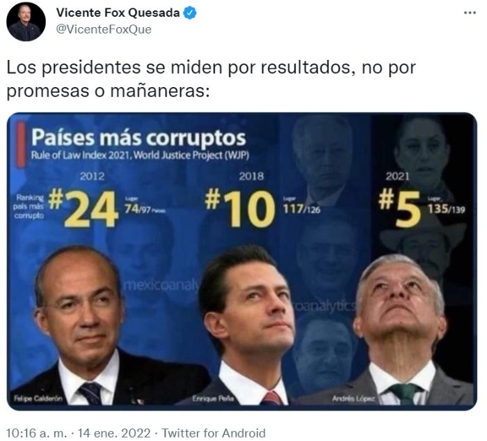 Vicente Fox arremetió de nueva cuenta contra el Presidente Andrés Manuel López Obrador (AMLO) al señalar que los mandatarios mexicanos se miden por resultados y "no por promesas o mañaneras".Fox, a través de sus cuentas en redes sociales, apuntó a la administración de AMLO y acusó que Morena y la 4T "se perfilan como el peor gobierno de los últimos tiempos".Fox escribió en Twitter:"Los presidentes se miden por resultados, no por promesas o mañaneras: Con datos duros y resultados reales, AMLO, 4T, MORENA se perfilan como el peor gobierno de los últimos tiempos!!".El expresidente Fox también compartió imágenes comparativas de los gobiernos de Carlos Salinas de Gortari, Ernesto Zedillo, Felipe Calderón, Enrique Peña Nieto y López Obrador sobre "los países más corruptos", economía, endeudamiento, asesinatos y pérdida de empleo.OA