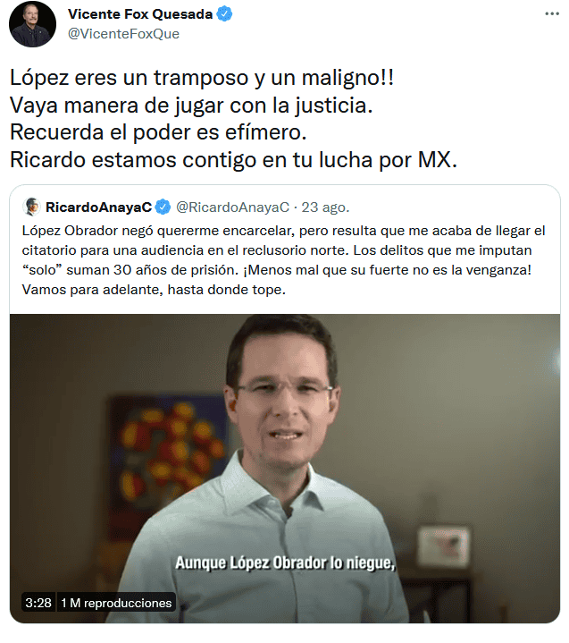 El ex presidente Vicente Fox salió en defensa de Ricardo Anaya, luego de que éste acusara al Mandatario Andrés Manuel López Obrador (AMLO) de querer encarcelarlo A través de redes sociales, Fox señaló a López Obrador de ser "un tramposo y un maligno", además de jugar con la justicia.El expresidente de México también refirió que "el pueblo bueno" le falló a López Obrador con la consulta de juicio a expresidentes."Si eres vengativo. Si eres dictador. Si eres maléfico y tramposo. Eres un TARTUFO!! No acabarás con la Democracia, la Libertad y con la oposición", añadió en otro mensaje.Por su parte, AMLO volvió a retomar el tema de Anaya y le pidió no salir del país para defenderse de las acusaciones de la entrega de sobornos para aprobar la Reforma Energética en el sexenio pasado y reiteró que no hay una persecución política contra el panista.Antes, en su conferencia del lunes AMLO le dijo a Anaya que "no sea marrullero, se le hace fácil decir, "me persiguen, me persiguen", se le hace fácil decir. Nosotros no somos represores, nosotros no odiamos, no somos como ellos, somos distintos. Nosotros tenemos principios, tenemos ideales, tenemos moral, pero es una maniobra politiquera, el querer salir adelante", expresó López Obrador.Si te interesó esta noticia y quieres saber más, entonces descarga y descubre INFORMAPlus, la aplicación digital de EL INFORMADOR, en donde tenemos contenidos exclusivos, seleccionados por nuestros editores, para darles una experiencia más completa a los lectores.Descarga la aplicación y pruébala GRATIS por treinta días.Para iOS: https://apple.co/35jaVgbPara Android: https://bit.ly/3gwVSEVSi eres suscriptor de EL INFORMADOR tu acceso está incluido, solicítalo al 33 3678-7777GC