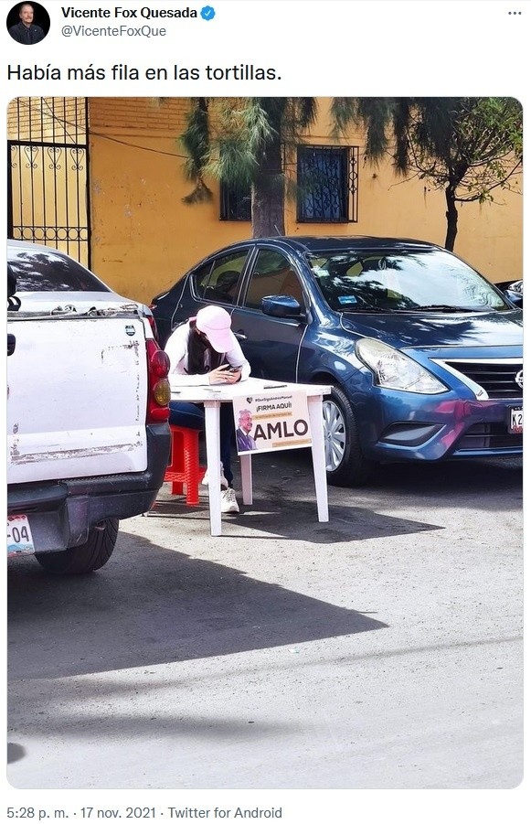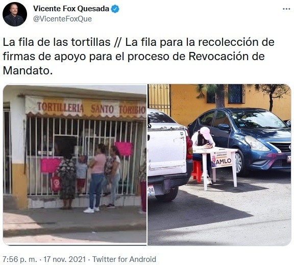 El expresidente Vicente Fox arremetió esta mañana, otra vez, contra el Presidente Andrés Manuel López Obrador (AMLO) y sus seguidores por la consulta de revocación de mandato.Fox, a través de su cuenta de Twitter, se burló de los simpatizantes de AMLO al comprar la fila que hacen en un módulo de apoyo para colaborar con su firma a la permanencia del Mandatario en el gobierno con la "fila de las tortillas".Vicente Fox escribió: "La fila de las tortillas // La fila para la recolección de firmas de apoyo para el proceso de Revocación de Mandato", junto a dos fotografías comparativas entre una tortillería y un módulo donde se recaban firmas de la ciudadanía para "que siga Andrés Manuel" sin personas.Antes de la primera publicación, Fox había escrito: "Había más fila en las tortillas", junto a la foto de un módulo vació.OA