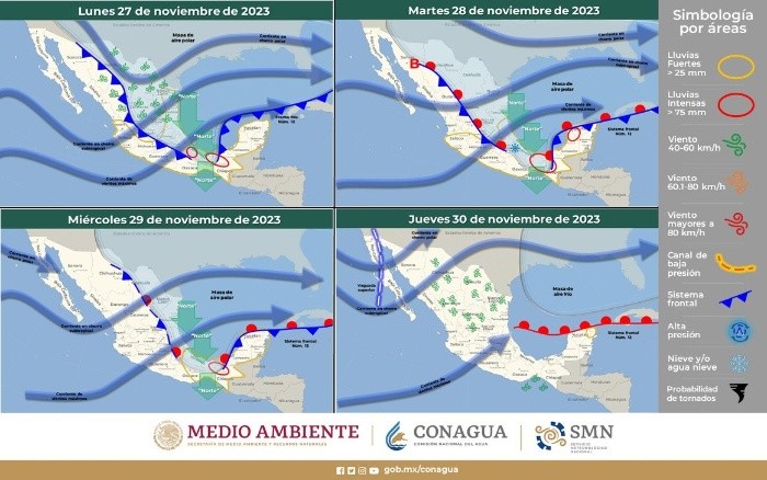 El frente frío número 12, llegará con lluvias intensas, heladas y granizo. Se prevé en 12 entidades de la República Mexicana, desde hoy hasta el 30 de noviembre, temperaturas menores a los 5° centígrados y en algunos estados hasta -10° centígrados, según el pronóstico del Servicio Meteorológico Nacional (SMN).Se anticipan cambios notables en el pronóstico debido a las corrientes en chorro polar y subtropical; desplazándose sobre el norte y noreste de la República Mexicana, causará lluvias puntuales fuertes y descenso de las temperaturas por la noche y madrugada.El abundante ingreso de humedad hacia el Océano Pacífico ocasionará lluvias y chubascos, acompañados de descargas eléctricas, esto sobre el occidente, centro y sur del país. Todas las lluvias pronosticadas podrán estar acompañadas de descargas eléctricas y rachas de viento.Con información del Servicio Meteorológico Nacional * * * Mantente al día con las noticias, únete a nuestro canal de WhatsApp * * *