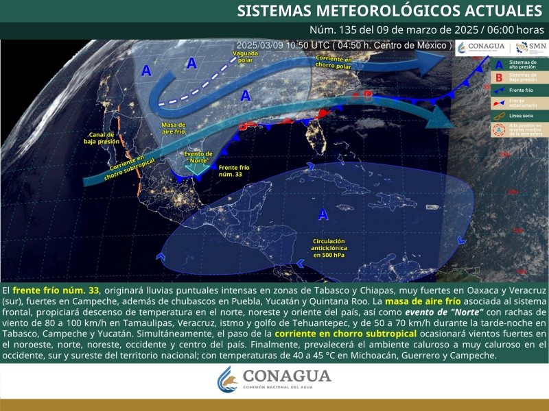 Para este domingo, el Servicio Meteorológico Nacional informa que el frente frío 33 se desplazará sobre el litoral del golfo de México, originando lluvias puntuales intensas en zonas de Tabasco y Chiapas, muy fuertes en Oaxaca y Veracruz, fuertes en Campeche, además de chubascos en Puebla, Yucatán y Quintana Roo.Por otro lado, la masa de aire frío asociada al sistema frontal, propiciará descenso de temperatura en el norte, noreste y oriente del país, así como evento de "Norte" con rachas de viento de 80 a 100 km/h en Tamaulipas, Veracruz, istmo y golfo de Tehuantepec.Además, prevalecerá el ambiente caluroso a muy caluroso en el occidente, sur y sureste del territorio nacional; con temperaturas de 40 a 45 °C en Michoacán, Guerrero y Campeche.*Con información del SMN.*Mantente al día con las noticias, únete a nuestro canal de WhatsApp aquí: https://whatsapp.com/channel/0029VaAf9Pu9hXF1EJ561i03 MV
