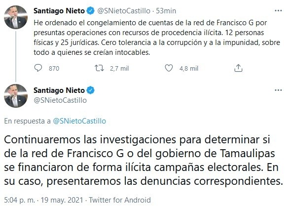 Ricardo Monreal, senador de Morena, afirmó hoy que se giró una orden de aprehensión contra el gobernador de Tamaulipas, Francisco García Cabeza de Vaca, aunque el Gobierno federal no lo ha confirmado y a pesar de que persisten dudas sobre su desafuero."Insólito: orden de aprehensión al gobernador de Tamaulipas que el Congreso local decidió mantener indebidamente en el cargo, cuando tuvo que haber nombrado sustituto" dijo Monreal a través de su cuenta de Twitter."Ante la crisis constitucional del Ejecutivo local en funciones fugado, se precisan acuerdos y que el Senado actúe".La Fiscalía General de la República (FGR) que acusa a García Cabeza de Vaca de corrupción, nexos con el crimen organizado y defraudación fiscal,no ha emitido información oficial respecto a la orden de captura en su contra.La Unidad de Inteligencia Financiera (UIF) anunció esta tarde que congeló las cuentas de la red ligada al gobernador García Cabeza de Vaca."He ordenado el congelamiento de cuentas de la red de Francisco G por presuntas operaciones con recursos de procedencia ilícita. 12 personas físicas y 25 jurídicas. Cero tolerancia a la corrupción y a la impunidad, sobre todo a quienes se creían intocables", informó en Twitter Santiago Nieto, titular de la UIF.La UIF, organismo de la Secretaría de Hacienda federal, ya había realizado una investigación contra el gobernador de Tamaulipas por defraudación fiscal equivalente a 6.5 millones de pesos y una supuesta compraventa ilegal de unas casas en Estados Unidos.El caso de García Cabeza de Vaca provocó un enfrentamiento entre la Cámara de Diputados, que le retiró el fuero para permitir que sea procesado, y el Congreso de Tamaulipas, que aprobó mantener la inmunidad al gobernador.Desde el pasado 30 de abril, la Cámara de Diputados había aprobado la solicitud de la FGR de desaforar a García Cabeza de Vaca por los delitos de delincuencia organizada, operación de recursos con procedencia ilícita y fraude fiscal.La Suprema Corte Justicia de la Nación (SCJN) desechó el pasado 14 de mayo un recurso de inconstitucionalidad presentado por la cámara tamaulipeca, pero no aclaró la situación del gobernador.Con información de EFEIM