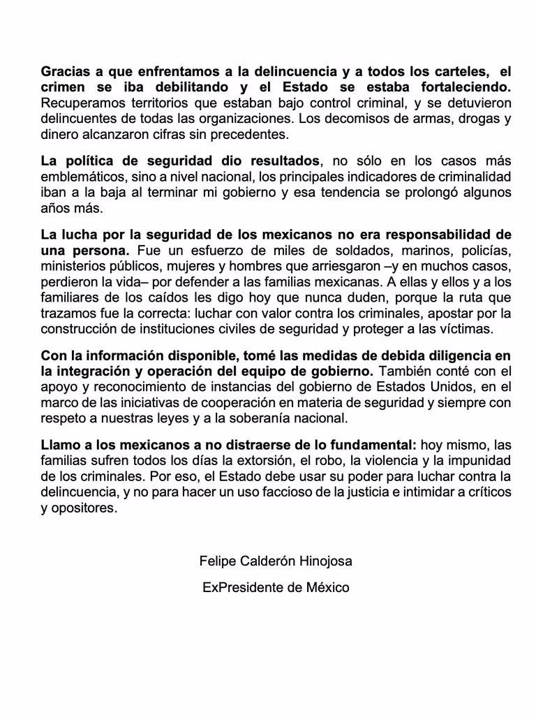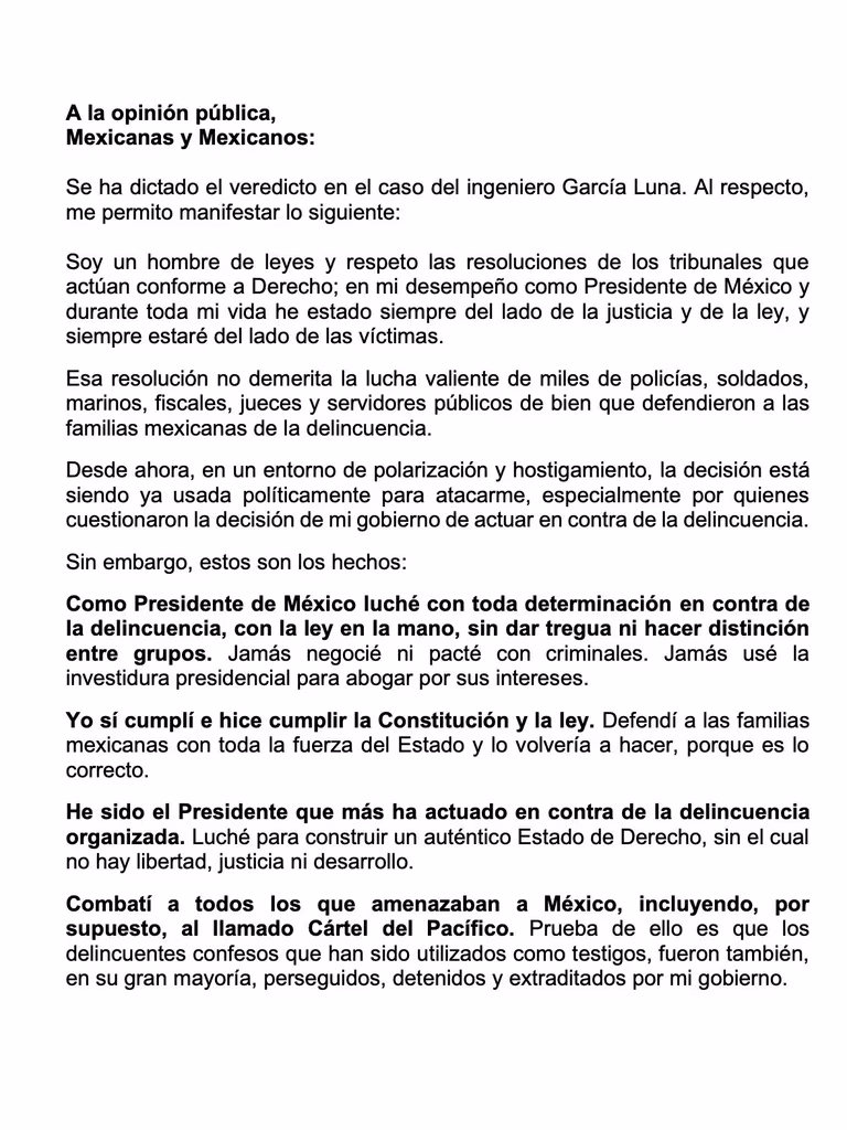 El expresidente Felipe Calderón rompió el silencio sobre el juicio a Genaro García Luna, horas después de que a su exsecretario de Seguridad Pública se le encontrara culpable de cinco cargos en Estados Unidos.A través de un comunicado en Twitter, Calderón explicó que se reconoce como “un hombre de leyes” y el “presidente que más ha actuado en contra de la delincuencia”, además, mencionó que “nunca pactó con criminales”.En el texto, dirigido a la opinión pública y a la población de México, Felipe Calderón defendió su estrategia de seguridad contra el crimen organizado.“Esa resolución no demerita la lucha valiente de miles de policías, soldados, marinos, fiscales, jueces y servidores públicos de bien que defendieron a las familias mexicanas de la delincuencia.”, escribió.Calderón, quien estuvo al frente del Ejecutivo de 2006 a 2012, aseguró que su estrategia Guerra contra el narcotráfico combatió al grupo delincuencial conocido como Cártel del Pacífico. “Prueba de ello es que los delincuentes confesos que han sido utilizados como testigos fueron también, en su gran mayoría, perseguidos, detenidos y extraditados por mi gobierno”. La secretaria de Morena, Citlalli Hernández exigió a Calderón y Margarita Zavala explicar su relación con García Luna.Hernández tildó de “cobardes” a los diputados del PAN por presuntamente abandonar la sesión de San Lázaro, luego de que la Corte de Brooklyn declaró culpable al exsecretario de Seguridad en el gobierno de Calderón.CR
