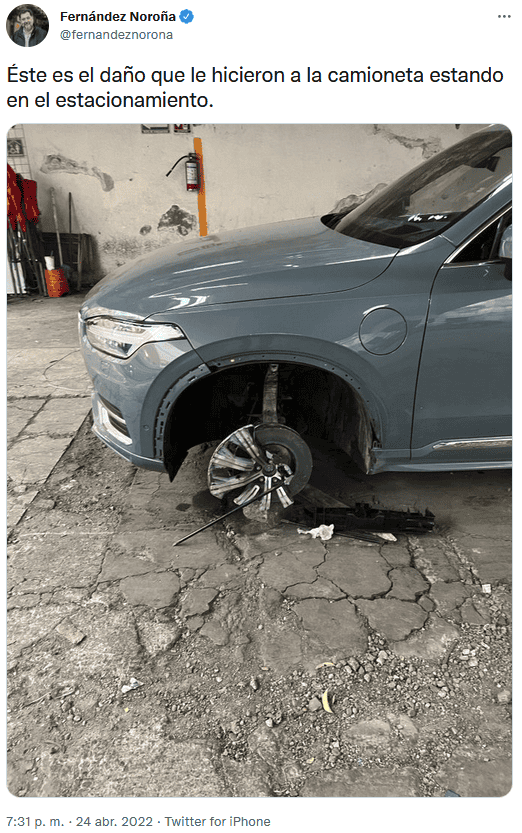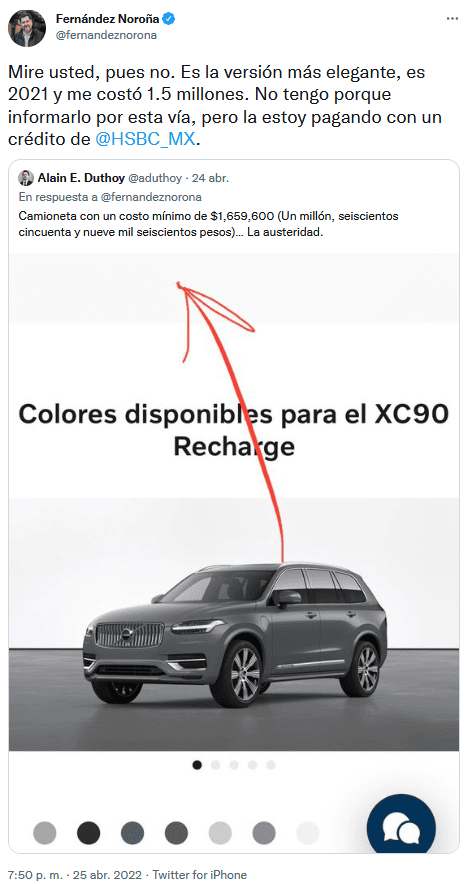 El pasado domingo, el diputado Gerardo Fernández Noroña subió a redes sociales una fotografía del daño que le hicieron a su camioneta en un estacionamiento.Tras publicar la imagen, usuarios de redes criticaron "la austeridad" del aspirante presidencial para 2024. Aseguraron que el vehículo del diputado del Partido del Trabajo tiene "un costo mínimo" de un millón 659 mil pesos, de acuerdo con la marca de automóviles. Ante el señalamiento, Fernández Noroña respondió que su camioneta Volvo "es la versión más elegante", pero modelo 2021 y le costó "1.5 millones", además que la está pagando con un crédito bancario. "Mire usted, pues no. Es la versión más elegante, es 2021 y me costó 1.5 millones. No tengo porque informarlo por esta vía, pero la estoy pagando con un crédito de HSBC", contestó el diputado del Trabajo. Aunque el aspirante presidencial fue criticado por adquirir el costoso vehículo para algunos, otros usuarios defendieron que Fernández Noroña lo esté pagando "con su dinero". OA