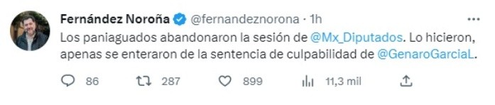 Este martes el exsecretario de Seguridad Pública de México, Genaro García Luna, fue declarado culpable de cinco cargos en Estados Unidos, entre ellos culpable por narcotráfico y sus nexos con el crimen organizado, en particular el Cártel de Sinaloa durante el sexenio el expresidente Felipe Calderón.Luego de que el juez Brian Cogan declarara culpable a García Luna, en el juicio que se llevó a cabo en Nueva York, Estados Unidos, el diputado del Partido del Trabajo (PT), Gerardo Fernández Noroña, se pronunció al respecto en su cuenta de Twitter y lanzó un mensaje a Calderón, a quien acusa de también estar involucrado con el crimen organizado. "Oye #tomandanteborolas alias @FelipeCalderon, te pago el boleto a Nueva York. Te invito con mucho gusto. A" escribió Noroña en su tuit. Durante la sesión de este martes en la Cámara de diputados, Noroña aseguró que Calderón sabía de los vínculos de García Luna con Joaquín "El Chapo" Guzmán. "Pero todo el mundo sabía, cómo Calderón sabía de los vínculos de García Luna con el 'Chapo' Guzmán porque el propio Calderón los tenía", mencionóMencionó que al final todo saldrá a la luz, y espera que Calderón, Peña Nieto y Fox terminen en la cárcel."La verdad es que hoy sale a la luz con toda su fuerza y justicia cojea pero llega, Calderón acabará en prisión que es el lugar en el que debe estar, el mismo lugar que debe compartir con Fox y que debe compartir con Enrique Peña Nieto", dijo el diputado. Noroña también se tomó el tiempo de lanzarse contra los partidos de derecha, pues les recordó que fue él en 2010 quien acusó a García Luna de actos criminales ante la Comisión de Seguridad en la Cámara de Diputados."Culpable @GenaroGarciaL. El tiempo me dio la razón. ¿Que dirá ahora la derecha y los medios que han acallado siempre mi voz?", escribió. Finalmente les mandó un mensaje a los diputados del Partido Acción Nacional (PAN), quienes abandonaron la Cámara de Diputados este martes tras enterarse de la noticia de García Luna. Los paniaguados abandonaron la sesión de @Mx_Diputados. Lo hicieron, apenas se enteraron de la sentencia de culpabilidad de@GenaroGarciaL. MF