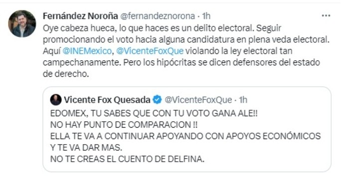 Las elecciones para el Estado de México y Coahuila comenzaron este domingo 4 de junio por lo que los partidos políticos y sus candidatos lanzan sus últimos mensajes hacia la gente para que voten por ellos. El expresidente de México, Vicente Fox, ha sido uno de los principales políticos que ha mostrado su apoyo a Alejandra Moral, candidata por la gubernatura del Estado de México de la alianza PRI-PAN-PRD quien compite contra Delfina Gómez del Partido Verde- Morena-PT.Vicente Fox publicó un tuit mostrando su apoyo a Alejandra Moral y pidiendo a la gente que vote por ella. "EdoMex, tu sabes que con tu voto gana ALE!! No hay punto de comparación!! ella te va a continuar apoyando con apoyos económicos y te va dar más. No te creas el cuento de Delfina", escribió Fox.Tras el mensaje, Gerardo Noroña, diputado del PT, le respondió a Fox diciéndole que era un delito electoral lo que está haciendo. "Oye cabeza hueca, lo que haces es un delito electoral. Seguir promocionando el voto hacia alguna candidatura en plena veda electoral. Aquí @INEMexico @VicenteFoxQue violando la ley electoral tan campechanamente. Pero los hipócritas se dicen defensores del estado de derecho", contestó Noroña. Noroña no paró con sus reclamaciones y mandó otro mensaje haciendo un llamado al INE. "Aquí el cabeza hueca@VicenteFoxQue violando la ley flagrantemente, llamando a votar por su candidata @INEMexico", finalizó Noroña. Vicente Fox no ha respondido a los mensajes de Noroña con quien es muy común hacer intercambio de palabras. MF