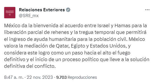 El Gobierno de México "dio la bienvenida" hoy miércoles al acuerdo anunciado entre Israel y el grupo palestino Hamás para comenzar con la liberación de rehenes en Gaza, donde se encuentran dos mexicanos secuestrados desde que inició el conflicto bélico hace mes y medio."México da la bienvenida al acuerdo entre Israel y Hamás para la liberación parcial de rehenes y la tregua temporal que permitirá el ingreso de ayuda humanitaria para la población civil", escribió la Secretaría de Relaciones Exteriores (SRE) en sus redes sociales.La tregua debe entrar en vigor el jueves y, durante ella, Hamás entregará a al menos 50 rehenes, la mayoría mujeres y niños, de los más de 240 que secuestró durante los ataques terroristas del pasado 7 de octubre, e Israel excarcelará a una primera tanda de 150 prisioneros palestinos sin condenas por delitos de sangre.Aunque no se ha aclarado las nacionalidades de los rehenes a liberar, la SRE ha identificado a Ilana Gritzewsky y Orión Hernández como los dos mexicanos que permanecen capturados por Hamás.Por otro lado, la Cancillería reconoció el avance del diálogo como "un paso hacia el alto el fuego definitivo"."México valora la mediación de Qatar, Egipto y Estados Unidos, y considera este logro como un paso hacia el alto el fuego definitivo y el inicio de un proceso político que lleve a la solución definitiva del conflicto", concluyó la SRE en su breve posicionamiento.El acuerdo contempla un alto el fuego de mínimo cuatro días, que podrá extenderse hasta un máximo de 10, en los que se detendrán los combates e incluye la entrada a la Franja de entre 100 y 300 camiones con alimentos, ayuda médica y combustible.Hamás asesinó a unas mil 200 personas en su ataque del 7 de octubre y en los ataques de represalias de Israel han muerto ya más de 11 mil personas.El Presidente de México, Andrés Manuel López Obrador, ha sostenido una postura de "neutralidad", en la que pide un diálogo para acabar con la guerra, pero ha avisado que no romperá relaciones con Israel.*Mantente al día con las noticias, únete a nuestro canal de WhatsAppOF