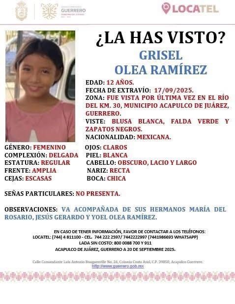 En Acapulco, Guerrero, se ha denunciado la desapreció de cuatro menores de edad que son hermanos. Todo en una zona de alta actividad del crimen organizado.Cuatro menores de edad, todos hermanos, fueron desaparecidos en el poblado El 30, en la zona rural de Acapulco.De acuerdo con fichas de búsqueda de Locatel, los cuatro hermanados fueron vistos por última vez el 17 de septiembre cuando estaban bañándose en el río del poblado El 30.A cuatro días de la desaparición de los menores, ninguna autoridad ha informado si hay operaciones de búsqueda. Incluso, del caso se supo la noche del sábado 20 de septiembre a través de las redes sociales, cuando Locatel difundió las fichas de búsqueda.Los cuatro menores fueron identificados como María del Rosario de 13 años; Grisel de 12; Jesús Gerardo de 10 y Yoel Olea Ramírez de 8 años.De acuerdo con las fichas de búsqueda de Locatel, María del Rosario vestía una blusa blanca, falda verde y zapatos negros; Grisel también vestía una blusa blanca y una falda verde; Jesús portaba una playera negra con franja blanca, short de mezclilla y tenis blancos, mientras que Yoel camisa blanca, pantalón azul y zapatos negros.El 19 de mayo, un comando armado realizó un ataque contra el poblado de El 30, donde murieron seis personas y tres más quedaron heridas.El 30 es el bastión de una de las organizaciones criminales más antiguas que operan en Acapulco, la familia Arismendi que mantiene un control férreo sobre ese poblado y las comunidades vecinas. * * * Mantente al día con las noticias, únete a nuestro canal de WhatsApp * * *OA