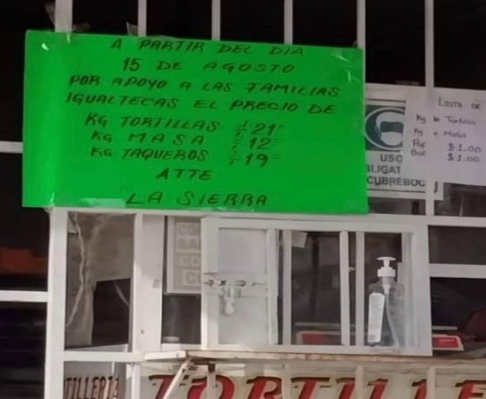 El precio del kilo de tortilla en Iguala, Guerrero, pasó de 23 a 21 pesos supuestamente por órdenes de la organización criminal el Cártel de la Sierra.Desde el lunes pasado, en los mostradores de tortillerías de Iguala se vio un letrero que anunciaba a los consumidores que a partir del 15 de agosto el precio de la tortilla sería de 21 pesos."A partir del 15 de agosto por apoyo a las familias igualtecas el precio del Kg. Tortilla 21. Kg. masa 12 y Kg. Taquería 19. Atte. La Sierra".Las imágenes de las cartulinas se difundieron en las redes sociales.De acuerdo con reportes de la prensa local, algunos establecimientos decidieron suspender el servicio ante las amenazas.En Iguala está ocurriendo lo contrario a otros municipios, donde el precio del kilogramo de tortilla va en aumento. Por ejemplo en Chilpancingo el precio de la tortilla pasó de 22 a 24 pesos. En Acapulco en algunas tortillerías vale hasta los 29 pesos.En Iguala no es la primera vez que organizaciones sociales imponen los precios de productos básicos como las tortillas, el refresco, la carne, el pollo y hasta la cerveza.En municipios como Huitzuco, el Cártel de la Sierra no sólo ha impuesto precios, sino que controla la comercialización y distribución de la carne. La mayoría de la carne que se consume en ese municipio llega de Morelos e ingresa a los establecimientos sin ninguna revisión sanitaria.En Taxco, la organización criminal la Familia Michoacana obligó a los empresarios tortilleros a aumentar el precio del kilo de tortillas de 23 a 26 pesos para que pudieran cubrir la extorsión que les exigían.Hace dos meses en Zihuatanejo, más de 50 tortillerías tuvieron que suspender el servicio durante dos días por las amenazas del crimen organizado para que les pagaran la extorsión.JM