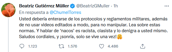 "Hablar de 'nacos' es racista, clasista y lo denigra a usted mismo", respondió Beatriz Gutiérrez Müller luego de la publicación del comediante y creador de contenidos, Chumel Torres, quien compartió un video en su cuenta de Twitter donde aparentemente la esposa del Presidente, Andrés Manuel López Obrador, pide que "retiren" al presidente de la Cámara de Diputados, Santiago Creel y a Alejandro Armenta, presidente del Senado."Pero qué nacadiiiiiiiisima Dios de bondad", fue el mensaje que acompañó al video publicado por Chumel Torres.Al conmemorar el 175 Aniversario de la Gesta Heroica de los Niños Héroes de Chapultepec, el diputado y el senador se encontraban caminando al lado del Presidente de México y al momento que Gutiérrez Müller se percata, aparentemente pide a una elemento militar que los retire.Gutiérrez Müller calificó su comentario como racista y clasista, "Usted debería enterarse de los protocolos y reglamentos militares, además de no usar videos editados a modo, para no manipular. Lea sobre estas normas"."Y hablar de 'nacos' es racista, clasista y lo denigra a usted mismo. Saludos cordiales, y ¡sonría, solo se vive una vez!".OA