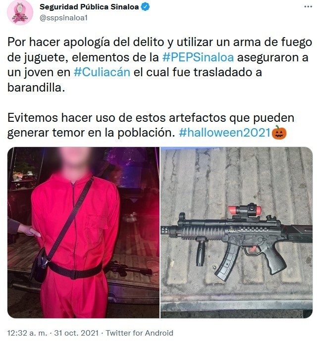Por los festejos de Halloween, autoridades de Sinaloa realizan operativos para evitar que circulen por las calles personas con disfraces y armas de fuego de juguete, lo cual está prohibido y constituye un acto de apología del delito. Ya hay detenidos.Este fin de semana, durante festejos de Halloween grupos mixtos del Ejército, la Guardia Nacional y las policías estatales y municipales detuvieron a 28 personas y 8 vehículos por portar disfraces con armas de fuego de juguete y decorar sus vehículos con pintura roja, simulando rastros de sangre y colocar muñecos en sus techos.La Secretaría de Seguridad Pública del Estado dio a conocer que varios de los detenidos fueron sorprendidos consumiendo bebidas alcohólicas en la vía pública por lo que fueron remitidos a barandilla. Entre las 28 personas detenidas se encuentran dos jóvenes con disfraces y máscaras portando rifles de juguete, en un acto de apología del delito, por lo que tuvieron que ser detenidos y remitidos a la barandilla de la Policía Municipal. Las autoridades de los tres niveles de gobierno fueron alertados durante la noche del sábado pasado sobre la circulación de un vehículo blanco con rastros de pintura roja en sus puertas y toldo, simulando rastros de sangre y un muñeco amarrado en el techo de la unidad, teñido de rojo.Más tarde en la colonia Prados, otro conductor de otra unidad, con adornos macabros similares, tuvo que ser detenido al igual que el operador de una camioneta color blanca salpicada de pintura de color rojo que simulaba ser sangre.Cristóbal Castañeda Camarillo, secretario de Seguridad Pública, advirtió que no habrá tolerancia para las personas que no respeten la ley, los cuales son detenidos y enviados a barandilla por violaciones. A través de las redes sociales, el funcionario comentó que en la colonia Prados, en la capital del estado, una segunda persona fue detenida y remitida a barandilla, por el tipo de disfraz que portaba en las calles y causaba temor entre los vecinos.Castañeda Camarillo recordó que en una primera acción, un joven con una máscara, un rifle de juguete y ropa en color negro que festejaba el Halloween en la capital del estado fue detenido por elementos de la Policía Estatal Preventiva y remitido a barandilla por alterar el orden. Sin establecer en qué lugar fue detenida esta persona, funcionario comentó que los operativos de vigilancia en el estado, sobre todo en Culiacán, van a continuar en este tipo de festejos de Halloween.Othon Herrera y Cairo Yarahuan, secretario del Ayuntamiento de Culiacán, dijo que se instruyó a la Policía Municipal no permitir la celebración de fiestas en la vía pública, con bebidas alcohólicas y personas disfrazadas. IM