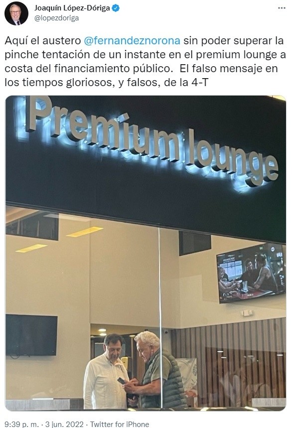 El periodista Joaquín López-Dóriga calificó de "falso austero" al diputado del PT, Gerardo Fernández Noroña, tras ser captado en una sala premium de un aeropuerto.A través de su cuenta de Twitter, el comunicador escribió "Aquí el austero Fernández Noroña, sin poder superar la p*nch* tentación de un instante en el premium lounge a costa del financiamiento público".Pero esa crítica no fue todo, ya que López-Dóriga llamó falso al legislador y a todos los apoyan la corriente de la Cuarta Transformación. "El falso mensaje en los tiempos gloriosos, y falsos, de la 4-T", expresó.Tras el comentario, difundido hace 12 horas y mismo que ya registra más de 2 mil 400 retweets, el legislador no ha respondido al periodista.Sin embargo, este no ha sido el único ataque que ha recibido Fernández Noroña, ya que apenas este martes 31 de mayo, la senadora del PAN, Lilly Téllez, se confrontó con el diputado federal del PT, Gerardo Fernández Noroña, a quien apodó como "el diputado changoleón" y dijo que el oficialismo está vinculado con el crimen organizado de cara a los comicios del 5 de junio en seis estados del país."Quiero confirmar que el diputado changoleón me está escuchando. Por favor explíquele al diputado changoleón que vino a meterse a esta cámara cómo operó el crimen organizado en Sinaloa. Póngame atención changoleón porque ustedes son el brazo político del crimen organizado", dijo desde su escaño la exmorenista y en un video que difundió en su cuenta personal de Twitter.OA