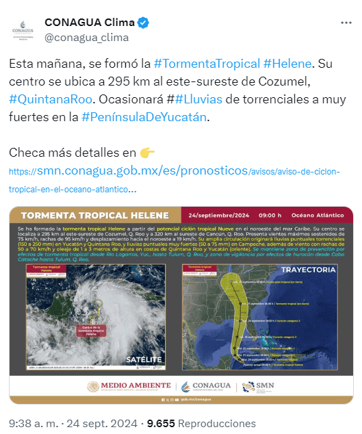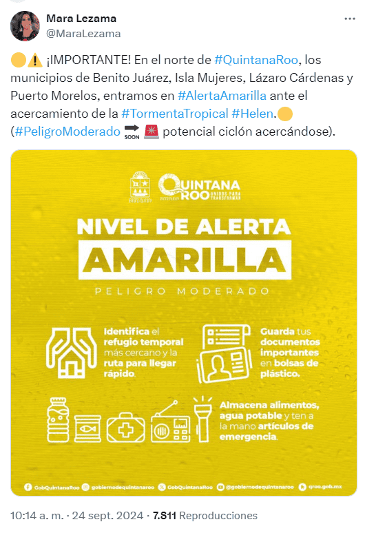Los municipios de Cancún, Lázaro Cárdenas, Puerto Morelos e Isla Mujeres en Quintana Roo pasaron hoy martes 24 de septiembre a Alerta Amarilla -por peligro moderado- ante la proximidad de la tormenta tropical "Helene", un potencial ciclón que se prevé provoque intensas lluvias en la zona norte del estado.Desde el Complejo de Seguridad (C5), luego de la reinstalación del Comité de Protección Civil en caso de Fenómenos Hidrometeorológicos, la gobernadora Mara Lezama informó que Solidaridad, Tulum, Cozumel y Felipe Carrillo Puerto escalaron a Alerta Verde -peligro bajo- y Othón P. Blanco, Bacalar y José María Morelos se mantienen en color azul, que significa peligro mínimo."Helene" se encuentra a 295 kilómetros del extremo oeste de Cuba, con vientos sostenidos de 75 kilómetros por hora, aumentó su desplazamiento a 19 kilómetros por hora, por lo cual sus efectos podrían resentirse antes de lo previsto originalmente.Esta tormenta tropical -subrayó- "es muy clara", y por las condiciones de la temperatura del mar, hasta el momento, no se contempla que el ojo del fenómeno toque tierra en Quintana Roo, pero sí se prevén afectaciones derivadas de las bandas nubosas, es decir, se espera mucha lluvia y viento. De cualquier modo, reiteró que, debido a que estos fenómenos pueden cambiar inesperada y súbitamente, se tienen que monitorear y estar preparado para cualquier variación.De entrada, anunció que a partir de esta tarde se suspenderán las clases en Isla Mujeres por motivos preventivos. La medida podría replicarse Cancún y Lázaro Cárdenas, pero todavía no se ha decidido.La Capitanía de Puerto Juárez decidió que, a partir de este mediodía cerrará totalmente la navegación general entre Cancún e Isla Mujeres. Las navieras han notificado la suspensión de servicios.En Holbox, municipio de Lázaro Cárdenas, se dispondrá de cruces gratuitos para abandonar voluntariamente la isla.En Cozumel, el arribo de cruceros se suspendió a partir de hoy y se espera se reponga el jueves. En el puerto de altura de Mahahual se mantienen las operaciones programadas, pero se suspenden mañana.Lezama Espinosa añadió que los cuatro Aeropuertos Internacionales localizados en Cancún, Cozumel, Tulum y Chetumal, mantienen su operación habitual y los vuelos programados transcurren con normalidad hasta este momento.Las y los presidentes municipales de Cancún, Isla Mujeres, Puerto Morelos, Solidaridad y Lázaro Cárdenas, Ana Patricia Peralta, Atenea Gómez, Blanca Merari Tziu, Lili Campos y Emir Bellos, informaron de las acciones preventivas como el desazolve de pozos, limpieza de alcantarillas, verificación de luminarias, número de refugios habilitados y el estado de fuerza con personal de distintas áreas municipales.*Mantente al día con las noticias, únete a nuestro canal de WhatsAppOF