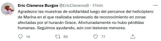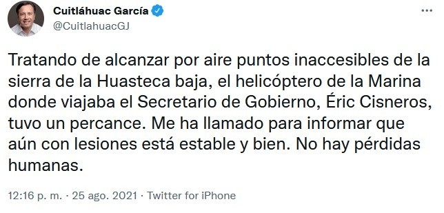 Un helicóptero en que viajaba el secretario de Gobierno de Veracruz, Eric Cisneros, se accidentó hoy en Agua Blanca, en el estado de Hidalgo, durante un sobrevuelo por zonas afectadas por el huracán "Grace", sin que se reporten víctimas mortales.El gobernador de Veracruz, Cuitláhuac García, informó que Eric Cisneros resultó con lesiones, pero que está bien luego del percance del helicóptero de la Secretaría de Marina que volaba en la sierra de la Huasteca baja."Tratando de alcanzar por aire puntos inaccesibles de la sierra de la Huasteca baja, el helicóptero de la Marina donde viajaba el Secretario de Gobierno, Éric Cisneros, tuvo un percance. Me ha llamado para informar que aún con lesiones está estable y bien. No hay pérdidas humanas", dijo el gobernador vía Twitter.Minutos después, el propio Cisneros informó en su cuenta de Twitter que tiene lesiones menores y agradeció las muestras de solidaridad tras el accidente.Si te interesó esta noticia y quieres saber más, entonces descarga y descubre INFORMAPlus, la aplicación digital de EL INFORMADOR, en donde tenemos contenidos exclusivos, seleccionados por nuestros editores, para darles una experiencia más completa a los lectores. Descarga la aplicación y pruébala GRATIS por treinta días. Para iOS: https://apple.co/35jaVgbPara Android: https://bit.ly/3gwVSEVSi eres suscriptor de EL INFORMADOR tu acceso está incluido, solicítalo al 33 3678-7777IM