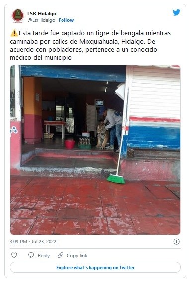 Expectación y temor causó entre los vecinos de la zona centro del municipio de Mixquiahuala, Hidalgo, la presencia de un tigre que se encontraba deambulando en la calle.De acuerdo con las testigos el felino, que portaba una correa, al parecer había escapado de un domicilio particular y luego ingresó a un negocio de tacos.Los vecinos de la zona al percatarse de su presencia buscaron resguardo, sin embargo, el animal no mostró ninguna conducta agresiva, además de que de manera inmediata un hombre se acercó al animal y tras algunos jaloneos logró meterlo a una casa.JM