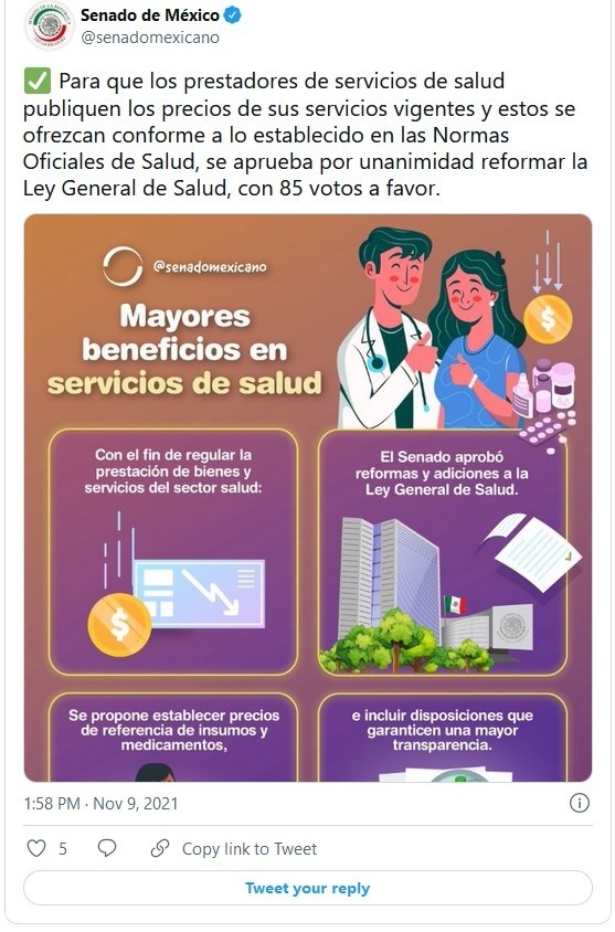 Por unanimidad, el Pleno del Senado de la República aprobó reformas a la Ley General de Salud para garantizar una mayor transparencia e información al paciente con relación a los servicios médicos que adquiere.El dictamen, aprobado en lo general y en lo particular por 85 votos, obliga a los prestadores de servicios de salud a proporcionar a los pacientes, por medios electrónicos o impresos, el detalle de precios y servicios aplicados como anexo a la factura respectiva.Establece que los prestadores de servicios de salud de carácter público y privado, incluyendo el servicio personal independiente y los servicios auxiliares de diagnóstico, deberán publicar los precios de sus servicios vigentes en el punto de ingreso del paciente y, en su caso, en los medios informativos.Además, exige que se otorgue a los pacientes toda la información necesaria para una mejor toma de decisiones relacionadas con su salud, no sólo respecto a la información sobre la eficacia y riesgo de los tratamientos, sino de los procedimientos en específico que conlleva cada intervención, monto aproximado sobre los precios y la existencia de terapias alternativas. El presidente de la Comisión de Salud del Senado, Américo Villarreal Anaya, señaló que la privatización de la salud no debe ser una amenaza para la disponibilidad, accesibilidad, aceptabilidad y calidad de los servicios.Por ello, subrayó que es necesario contar con una regulación que garantice el acceso a los servicios médicos sin que los ciudadanos sean víctimas de costos excesivos.Dijo que la propuesta busca disminuir el "gasto de bolsillo" que realizan los mexicanos, a través del fortalecimiento de las disposiciones legales establecidas, con el fin de evitar situaciones de lucro considerables. La senadora del PRI, Claudia Anaya Mota, advirtió sobre el incremento en los costos en materia de salud como consecuencia del uso de los servicios médicos privados, "cuando debe ser el Instituto de Salud para el Bienestar el que debe ofrecer y garantizar, de manera gratuita, la atención a los ciudadanos que acuden a recibir estos beneficios".JM