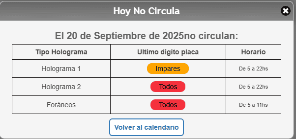 El programa Hoy No Circula Sabatino limita la circulación de los autos en función del último dígito de la placa y el color del engomado, con el objetivo de prevenir, minimizar y controlar la emisión de contaminantes a la atmósfera de la Zona Metropolitana del Valle de México. Según el informe más reciente del Sistema de Monitoreo Atmosférico de la Ciudad de México (CDMX) con corte a las 19:00 horas, la calidad del aire en la capital del país y la zona conurbada es buena, por lo que los niveles de contaminación no son lo suficientemente altos como para activar la contingencia ambiental.El programa Hoy No Circula Sabatino aplica de forma habitual el sábado 20 de septiembre del 2025 para los siguientes autos en la Ciudad de México (CDMX) y el Estado de México (Edomex). Al igual que durante la semana, los vehículos con holograma doble cero, cero, eléctricos e híbridos no están sujetos a restricciones en el programa.Recuerda que el horario del Hoy No Circula Sabatino es de las 5:00 de la mañana hasta las 10:00 de la noche, sin embargo, para los automóviles con placas foráneas, la restricción es más corta, de 5:00 a 11:00 horas.Desde el pasado mes de julio el Hoy No Circula tiene modificaciones; pues entró en vigor en las zonas metropolitanas del Valle de Toluca y de Santiago Tianguistenco en el Estado de México.Álvaro Obregón Azcapotzalco Benito Juárez Coyoacán Cuauhtémoc Cuajimalpa de Morelos Gustavo A. Madero Iztacalco Iztapalapa Magdalena Contreras Miguel Hidalgo Milpa Alta Tlalpan Tláhuac Venustiano Carranza XochimilcoAlmoloya de Juárez - Valle de Toluca Calimaya - Valle de Toluca Chapultepec - Valle de Toluca Lerma - Valle de Toluca Metepec - Valle de Toluca Mexicaltzingo - Valle de Toluca Ocoyoacac - Valle de Toluca Otzolotepec - Valle de Toluca Rayón - Valle de Toluca San Antonio la Isla - Valle de Toluca San Mateo Atenco - Valle de Toluca Temoaya - Valle de Toluca Tenango del Valle - Valle de Toluca Toluca - Valle de Toluca Xonacatlán - Valle de Toluca Zinacantepec - Valle de Toluca Almoloya del Río - Valle de Santiago Tianguistenco Atizapán - Valle de Santiago Tianguistenco Capulhuac - Valle de Santiago Tianguistenco Texcalyacac - Valle de Santiago Tianguistenco - Valle de Santiago Tianguistenco Santiago Tianguistenco - Valle de Santiago Tianguistenco Xalatlaco - Valle de Santiago Tianguistenco Atizapán de Zaragoza Coacalco de Berriozábal Cuautitlán Cuautitlán Izcalli Chalco Chicoloapan Chimalhuacán Ecatepec de Morelos Huixquilucan Ixtapaluca La Paz Naucalpan de Juárez Nezahualcóyotl Nicolás Romero Tecámac Tlalneplantla de Baz Tultitlán Valle de ChalcoNA