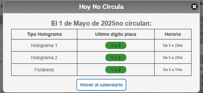 El programa Hoy No Circula limita la circulación de los autos en función del último dígito de la placa y el color del engomado, con el objetivo de prevenir, minimizar y controlar la emisión de contaminantes a la atmósfera de la Zona Metropolitana del Valle de México. Según el informe más reciente del Sistema de Monitoreo Atmosférico de la Ciudad de México (CDMX), con corte a las 18:00 horas, la calidad del aire en la capital del país y la zona conurbada es aceptable, por lo que los niveles de contaminación no son lo suficientemente alto para activar el Doble Hoy No Circula.En ese sentido el Hoy No Circula de este 1 de mayo en la CDMX y el Edomex aplica para lo siguientes autos: Mientras que los autos con los hologramas 00 y 0 están exentos de las limitaciones establecidas en el programa, así como los vehículos eléctricos e híbridos. Para que mañana puedas tomar tus precauciones, te recordamos que el horario del Hoy No Circula es desde las 5:00 de la mañana a las 10:00 de la noche, sin embargo, para los automóviles con placas foráneas, la restricción será de 5:00 a 11:00 horas.El Hoy No Circula aplica en las 16 alcaldías de la CDMX y en 18 municipios de Edomex:NA